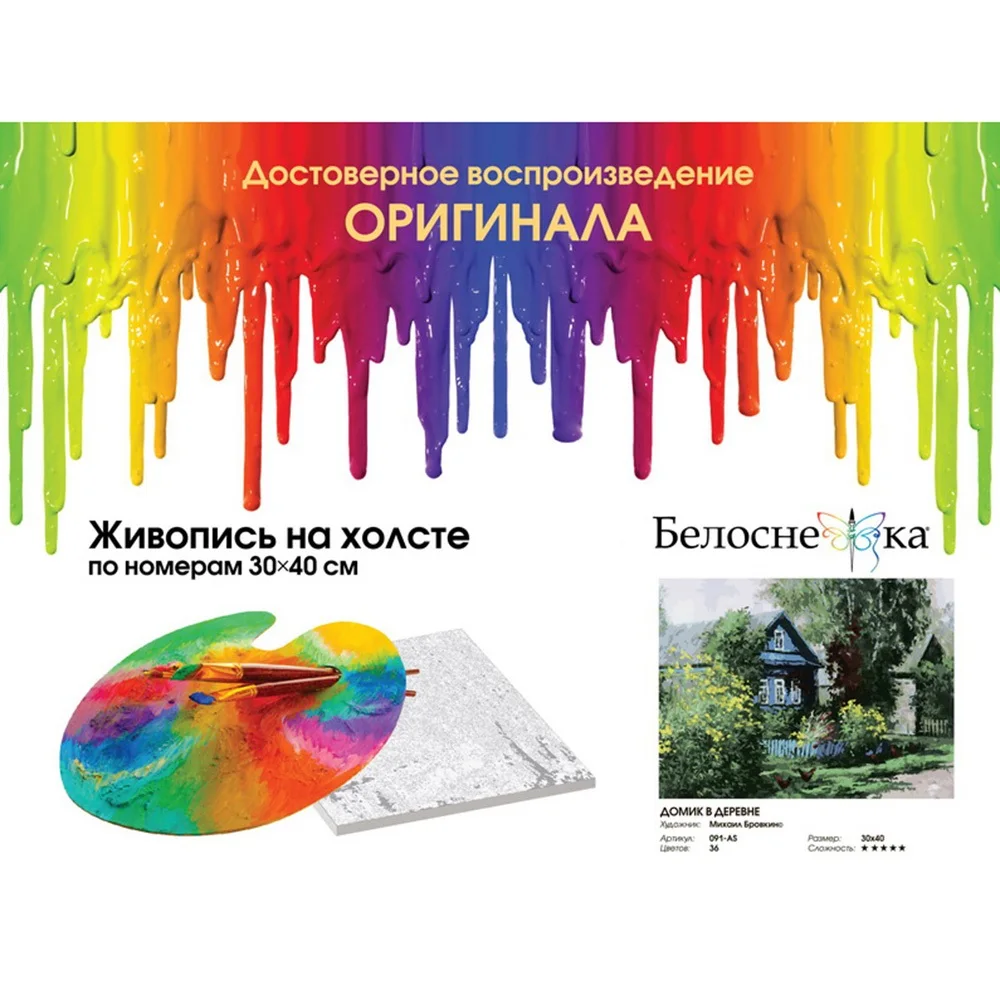 Набор для творчества “Живопись на холсте” от торговой марки “Белоснежка” содержит все необходимое для создания картины. В комплекте есть холст, натянутый на деревянный подрамник, на холсте контурами обозначены области для раскрашивания, внутри областей цифрой отмечен номер необходимой краски. Также в комплект набора для раскрашивания входит контрольный лист, по которому вы всегда можете свериться в ходе работы. В наборе есть акриловые краски, расфасованные в маленькие баночки, на крышках которых приклеен номер краски. Помните, акриловые краски- это быстросохнущий продукт, всегда плотно закрывайте не используемые баночки. В набор раскраски также входят 4 кисточки для акриловых красок, тонкая для раскрашивания мелких деталей и контуров, и средняя для закрашивания больших участков картины. Готовую картину закрепите на стене с помощью настенного крепления – шурупчики, веревочка, пластмассовый крючок и крепеж на рамку уже идут в комплекте.