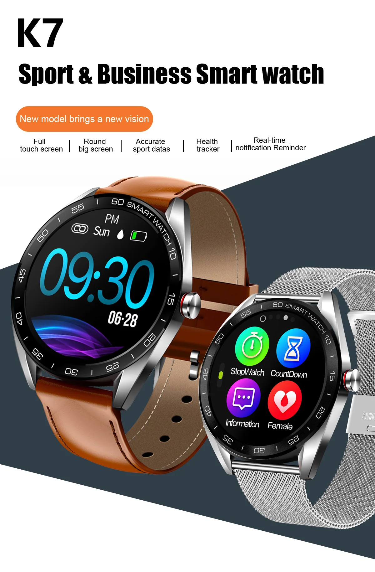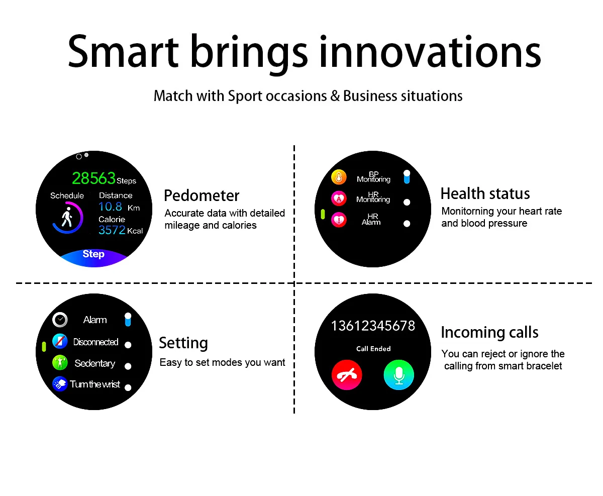 * IPS 、 1,3 дюймовый круглый экран * Сменный ремешок 22 мм * Обнаружение сердечного ритма/Обнаружение артериального давления * Таймер, шагомер, расход калорий, расчет расстояния, пульс, кровяное давление, время сна/ВКЛ и ВЫКЛ. * Многофункциональные спортивные функции (бег, футбол, бадминтон, баскетбол, плавание, езда, альпинизм, ходьба, шагомер, расход калорий, расчет расстояния) * Обнаружение сна (время сна, качество сна) * Напоминания о звонках, напоминания о SMS, трёхсторонние вечерние напоминания о сообщениях * Будильник, удаленная камера * Напоминание о задаче (напоминание о сидячем положении/напоминание о питьевой воде, напоминание о медицине, напоминание о встрече) * Синхронные данные в APK/APP * Загрузите «Hband» с Android market,Google play или Apple store * Отсканируйте qr-код и загрузите «Hband» Технические характеристики * Android версии 4,4 или выше; iOS версии 8,0 или выше; Поддержка bluetooth версии 4,0; * BLE 4,0 * NRF52832 * 64K (вспышка 512K) * 240*240 * 180 ма-ч * Доставка производится в течение 15 дней * 7-10days * Встроенный, вибрационное напоминание * IP68 * G-sensor