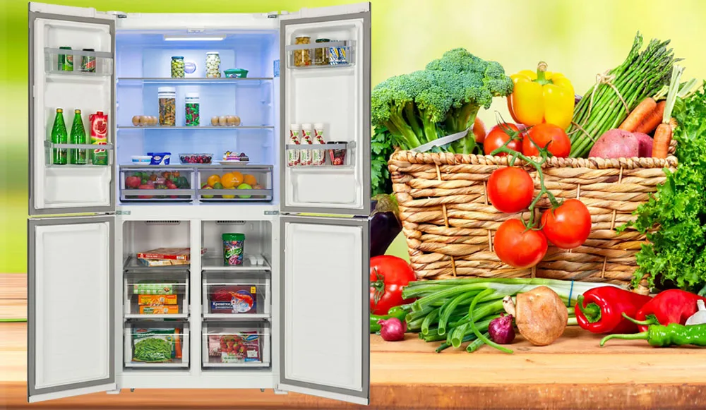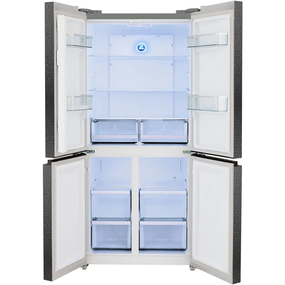 4-х дверный холодильник имеет общий объем 490 л, единое пространство верхних полок холодильной камеры, чтобы удобно было размещать габаритные кастрюли и контейнеры. Прочные полки из закаленного стекла можно регулировать по высоте, а ящики в холодильной камере предназначены для хранения овощей и фруктов.