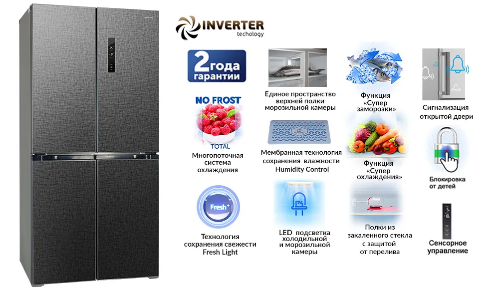 Холодильник HIBERG RFQ 490DX NFXQ обладает высоким классом энергоэффективности А+. Инверторный компрессор обеспечивает практически бесшумную работу с минимальным энергопотреблением.