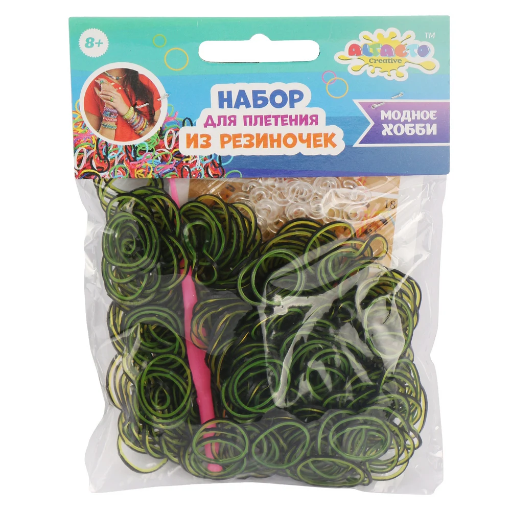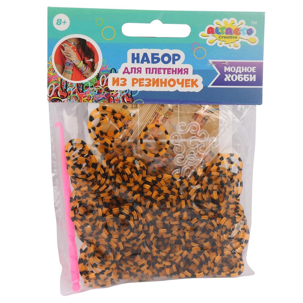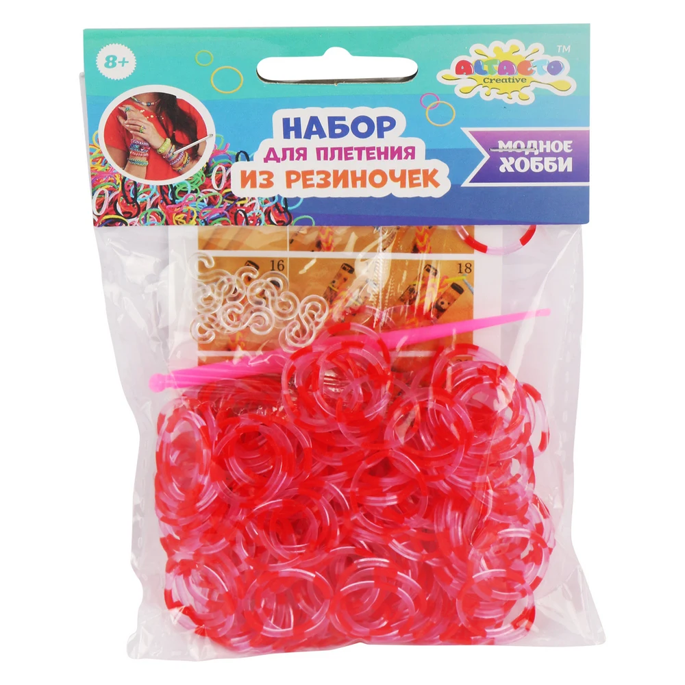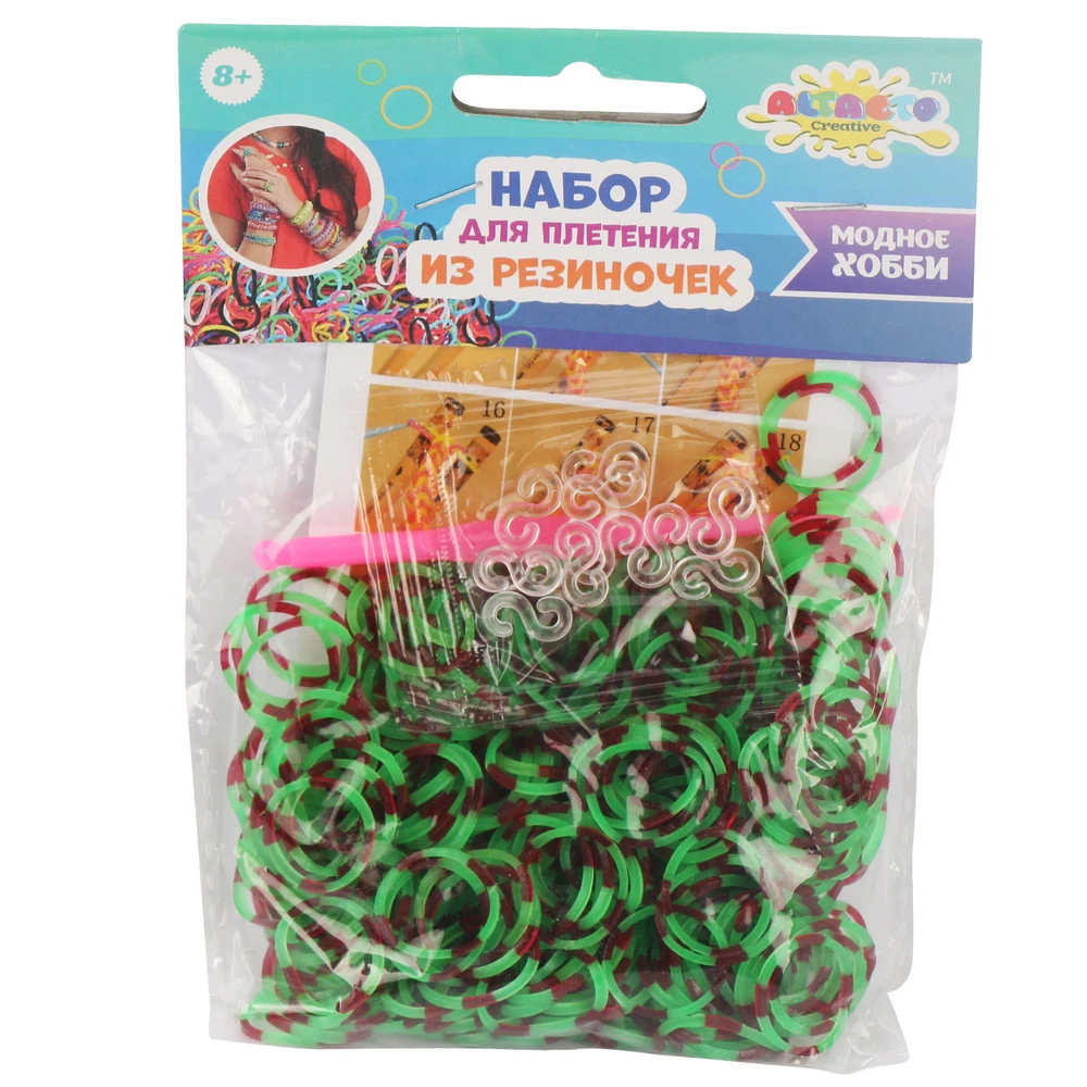 В одном пакетике содержится 300 полосатых резиночек, 1 крючок и 12 клипс. В ассортименте 12 упаковок.