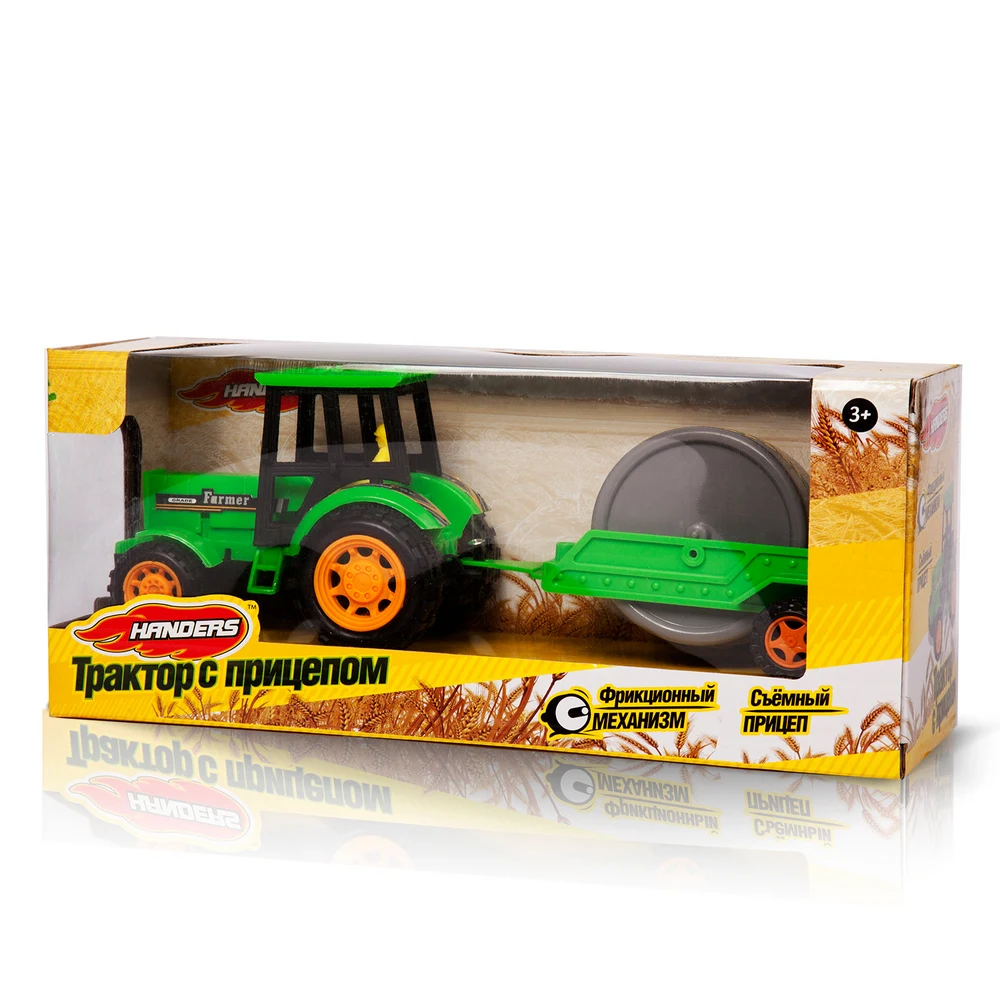Прицеп с подвижными элементами. Благодаря фрикционному двигателю трактор быстро разгоняется и во время движения издаёт характерный звук.
