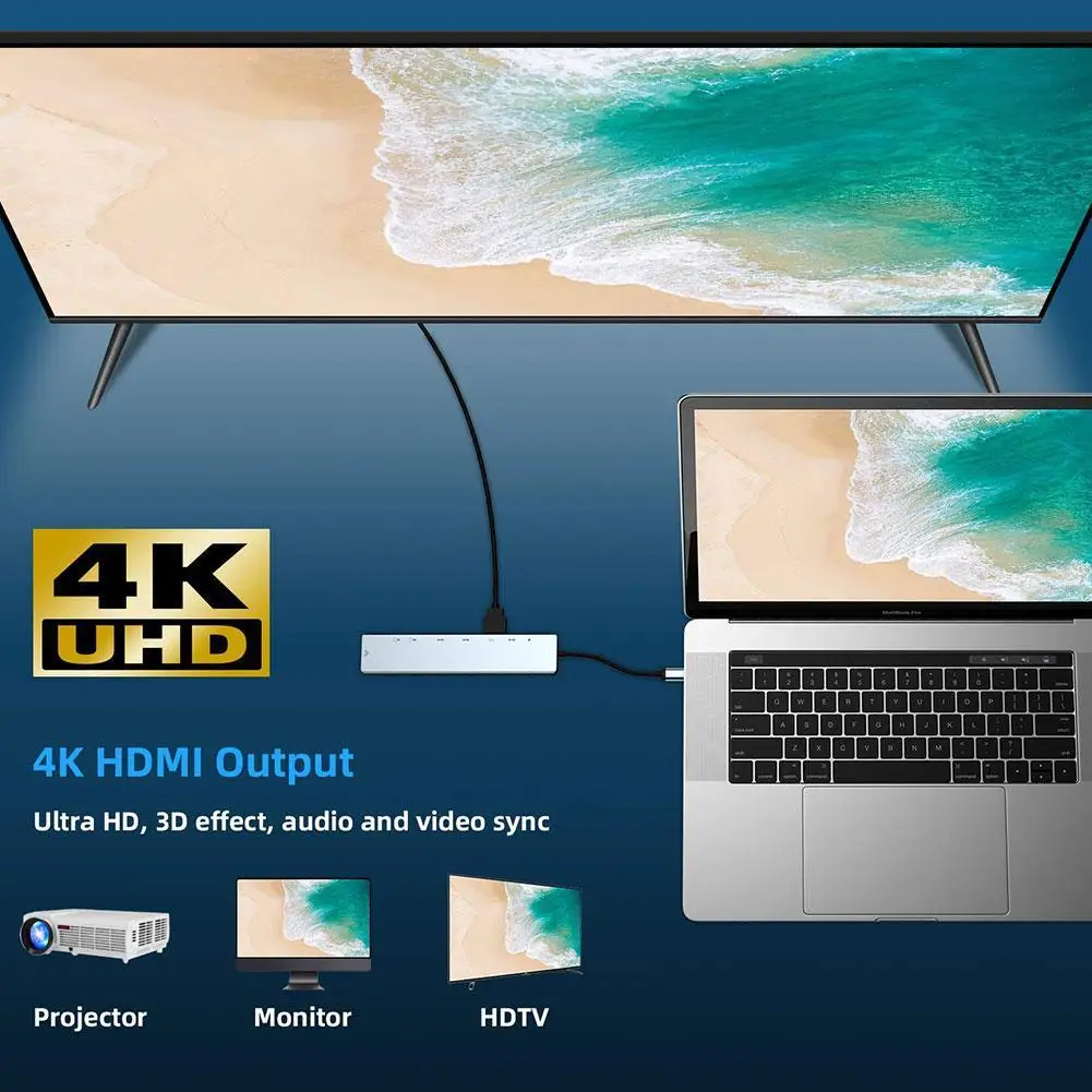 Это многофункциональные устройства высокой хаб высокой четкости, входные устройства с USB-C интерфейсом мобильных телефонов, планшетных компьютеров, ноутбуков и т. Д., USB-C интерфейс небольшой по размеру, поддерживает переднюю и обратную вставку, передачу данных, выход HDMI поддерживает разрешение видео до 3840X2160P/30 Гц, hd-дисплей выходного устройства, ЖК-телевизор и т. Д.