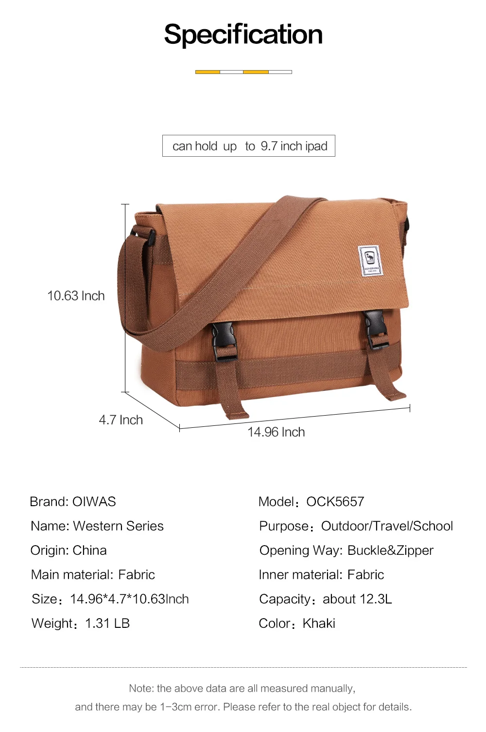 Информация: Бренд: OIWAS Артикул: OCK5655 Размер: 14,96x4,7x10,63 дюйма/38x12x27 см Емкость: 12,3 л Материал: нейлон Вес: 0,595 кг Цвет: хаки Посылка 1x сумка через плечо