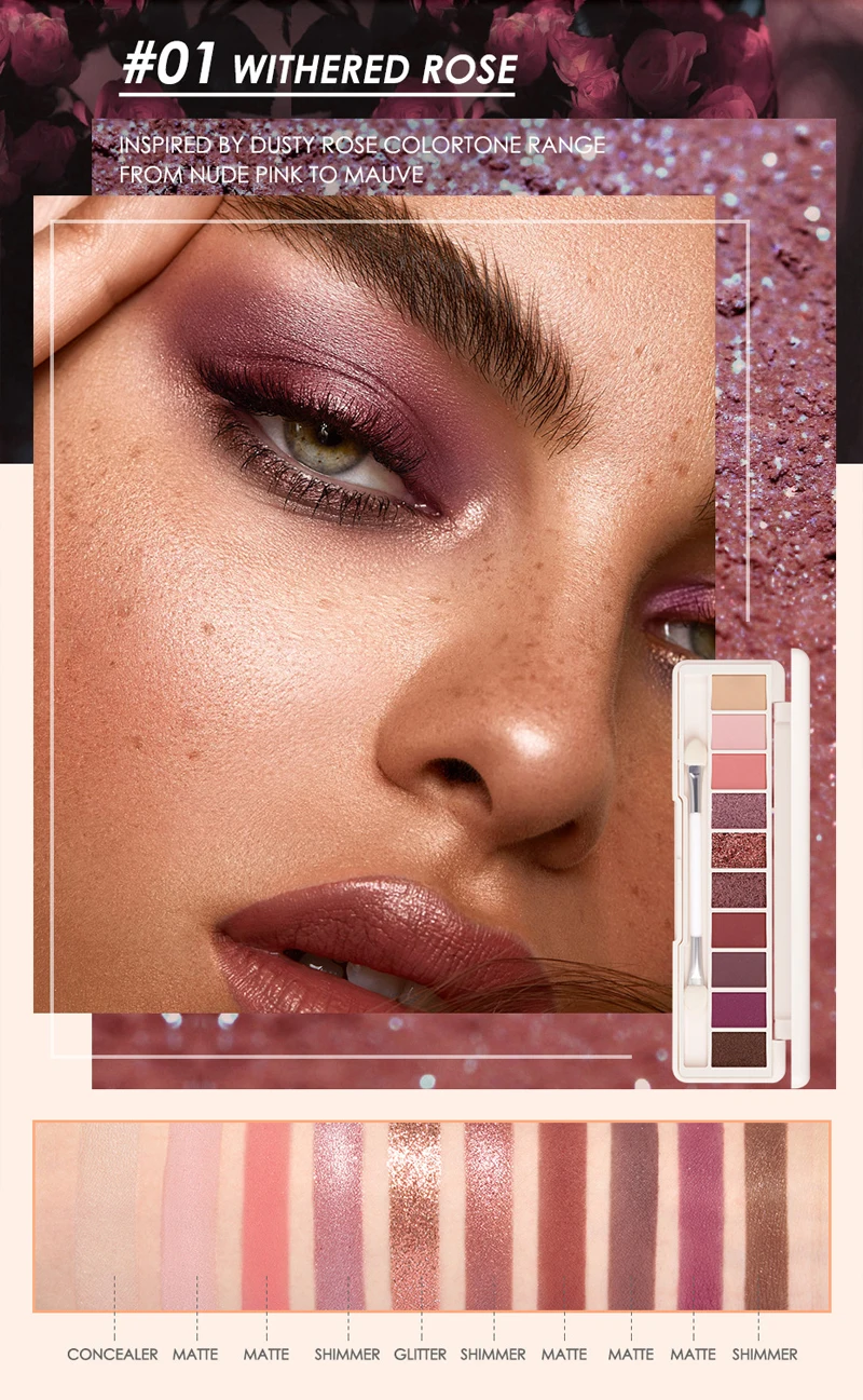 #1 Увядшая роза-состоит из 1 конселера, 5 матовых, 3 мерцающих и 1 блестящего оттенка, в диапазоне от розового до темно-коричневого.