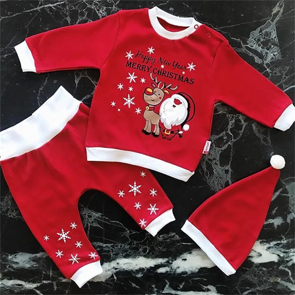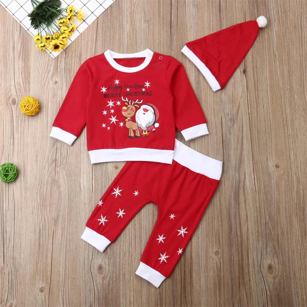 Зимняя Рождественская одежда для маленьких мальчиков и девочек 0-18 месяцев, комплект из 3 предметов, Детский комбинезон с длинными рукавами и Санта-Клаусом, Рождественский северный олень, футболка, штаны, шапка, комплект одежды, 2019