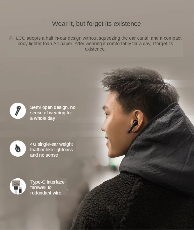 [Легкая одежда]:FII LCC имеет полуушную конструкцию, которая не сдавливает ушной канал. Его компактный корпус легче, чем бумага формата А4. Носится с комфортом в течение дня, но при этом запомнила свое наличие.