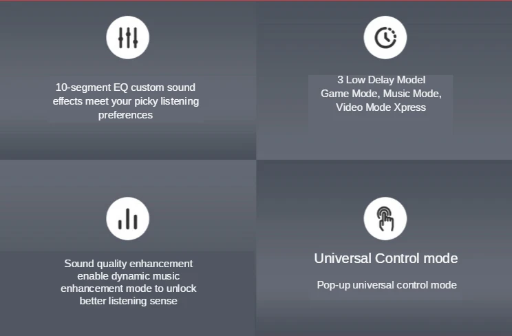 [Различные решения с низкой задержкой]:FII LCC использует три решения с низкой задержкой для трех вариантов: играть в игры, слушать музыку и смотреть видео, переключать по мере необходимости и наслаждаться плавным звуком и синхронизацией изображений