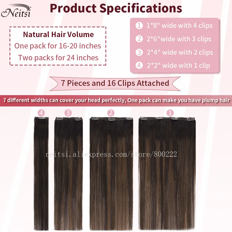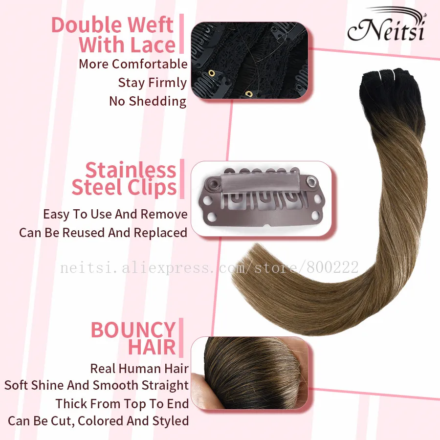 Натуральные накладные человеческие волосы Neitsi на заколках, машинка для наращивания волос на 16 заколках, натуральные бразильские волосы Remy, 16-24 дюйма, 7 шт. на всю голову