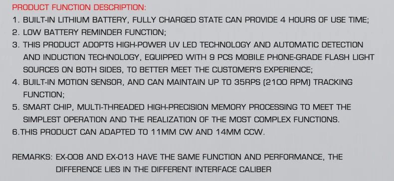 EX-008 и EX-013 имеют одинаковые функции и производительность, разница заключается в различных диаметрах интерфейса. EX-008 имеет нормальную резьбу 11 мм на основном корпусе и Резьбовой Адаптер 14 мм. EX-013 имеет реверсивную резьбу 14 мм на основном корпусе и прилагается переходник с нормальной резьбой 11 мм.