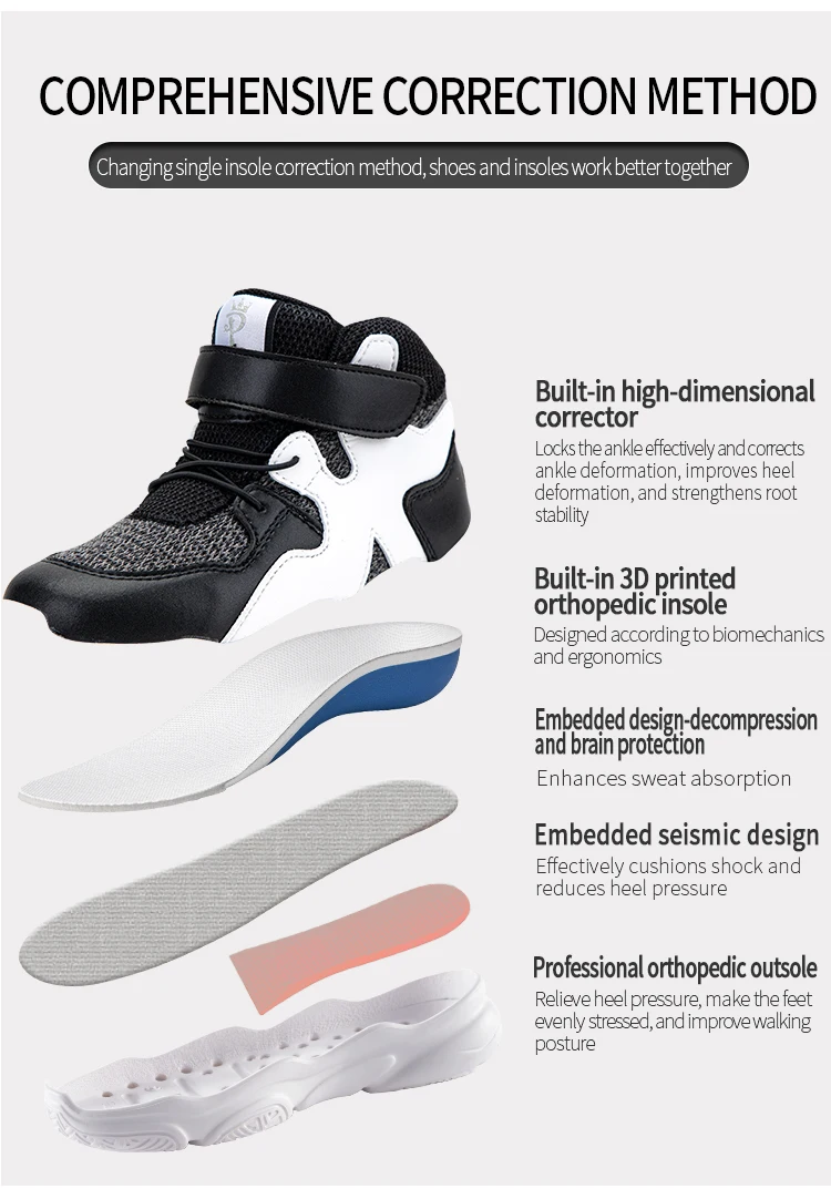 Эффективно поддерживает свод стопы и фиксирует пятку и лодыжку, чтобы ребенок мог поддерживать динамический баланс стопы во время ходьбы, улучшая неправильный стресс на ногах, регулировка и поддержание нормального роста костей и мышц стопы