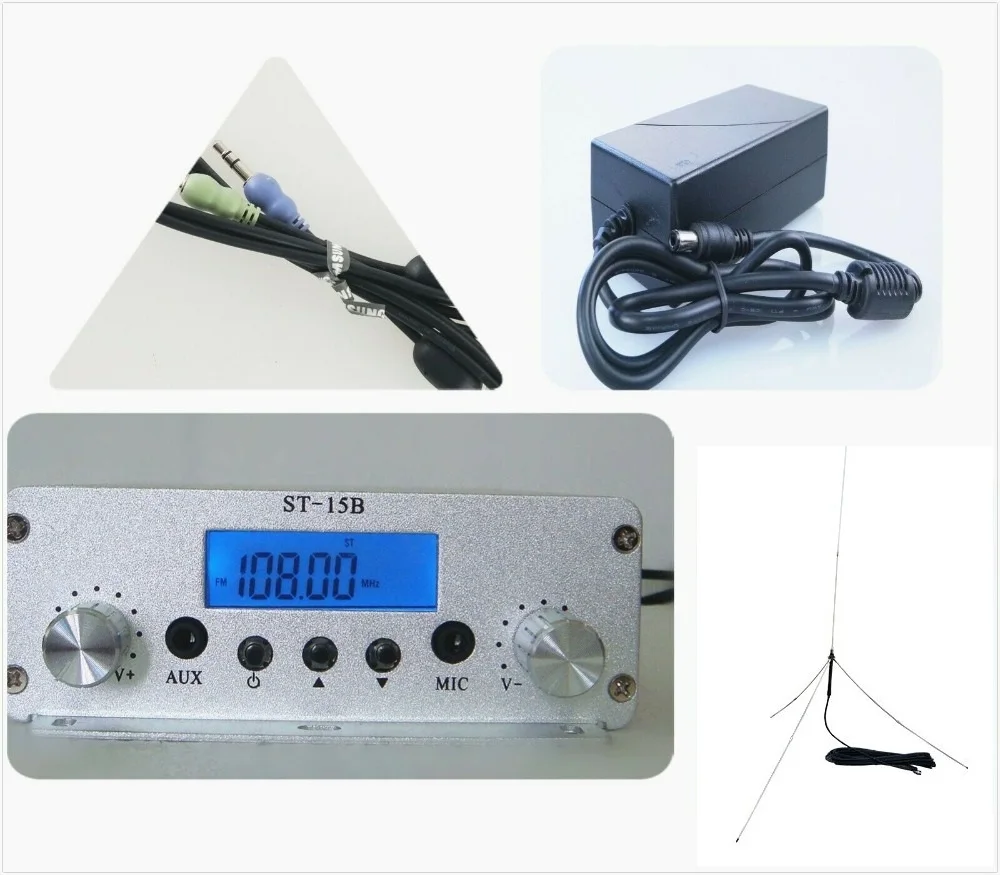 Система фазового замка (PLL) Мощность: 1,5 W/15W V2: диапазон Frenquency: 87-108 МГц1,5 W/15W Посылка включает: 1 X fm-передатчик 15 Вт 1 x источник питания 1 x Антенна GP1 с кабелем 15 метров 1X стерео аудио 3,5 Кабель (1,5 м)