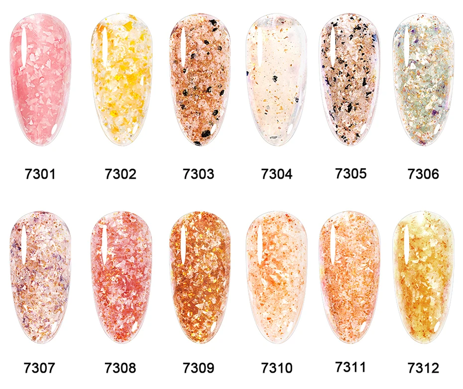 1.Шелковистые хлопья и блестящий порошок добавляют в ваши ногти привлекательный блеск. Обнимайте изысканный, мечтательный и гламурный маникюр с блестящим фантазийным гелевым лаком!