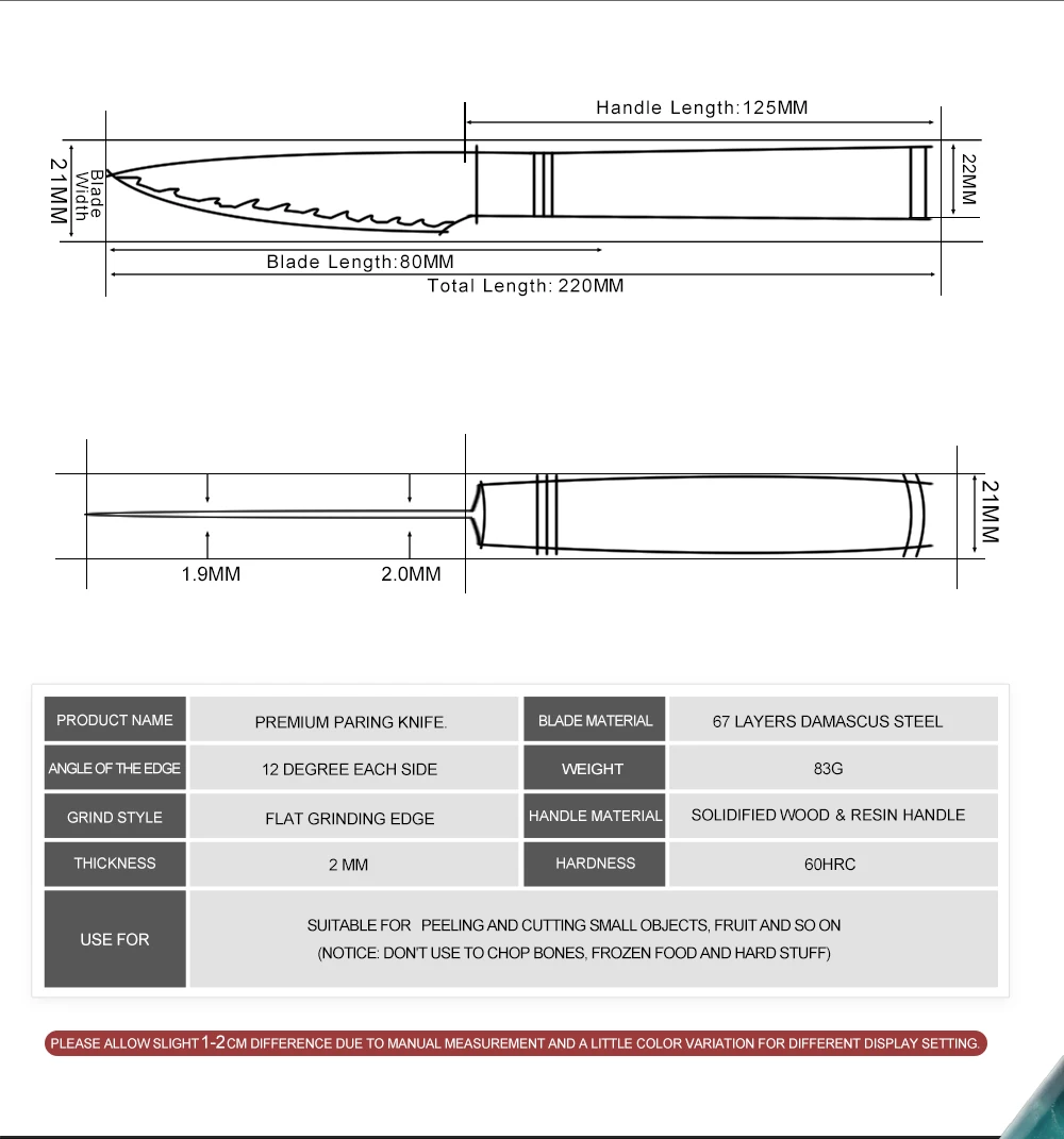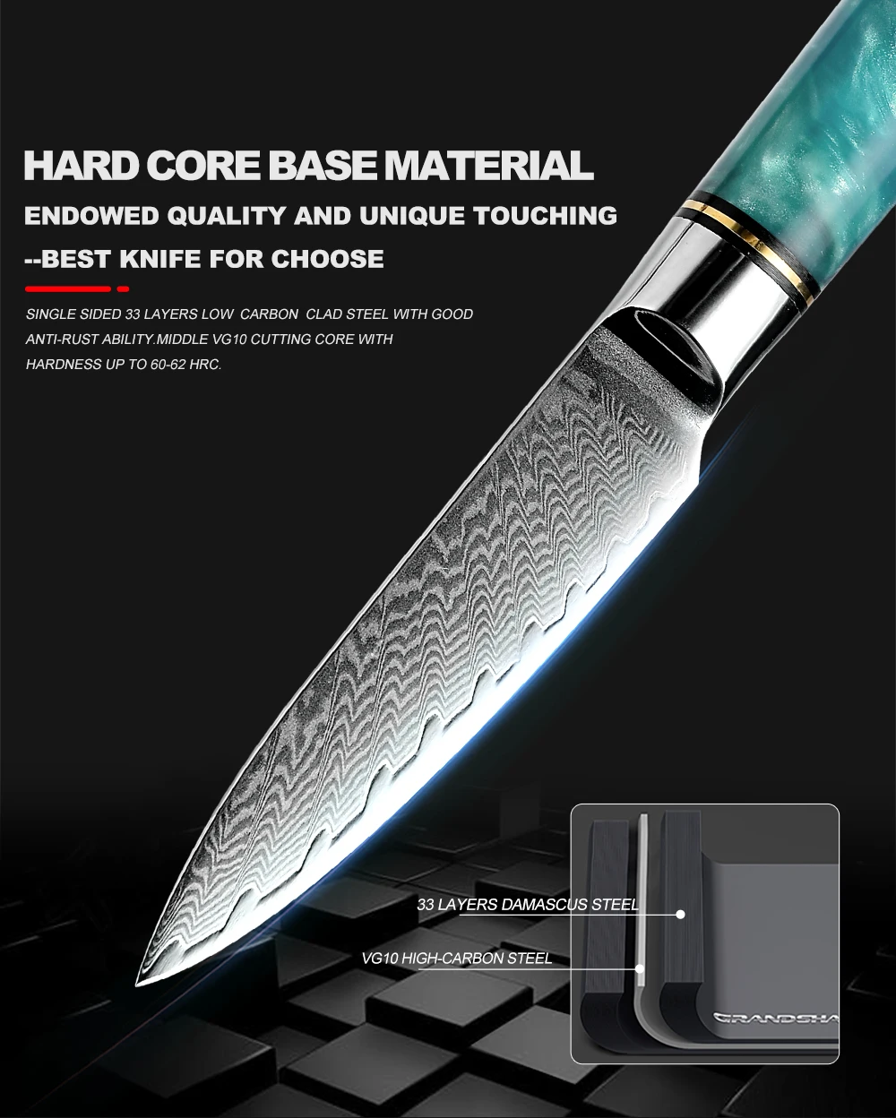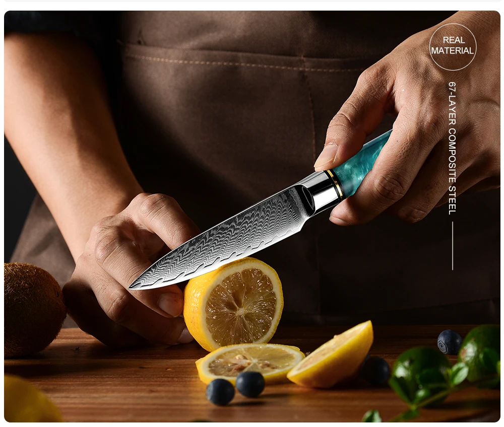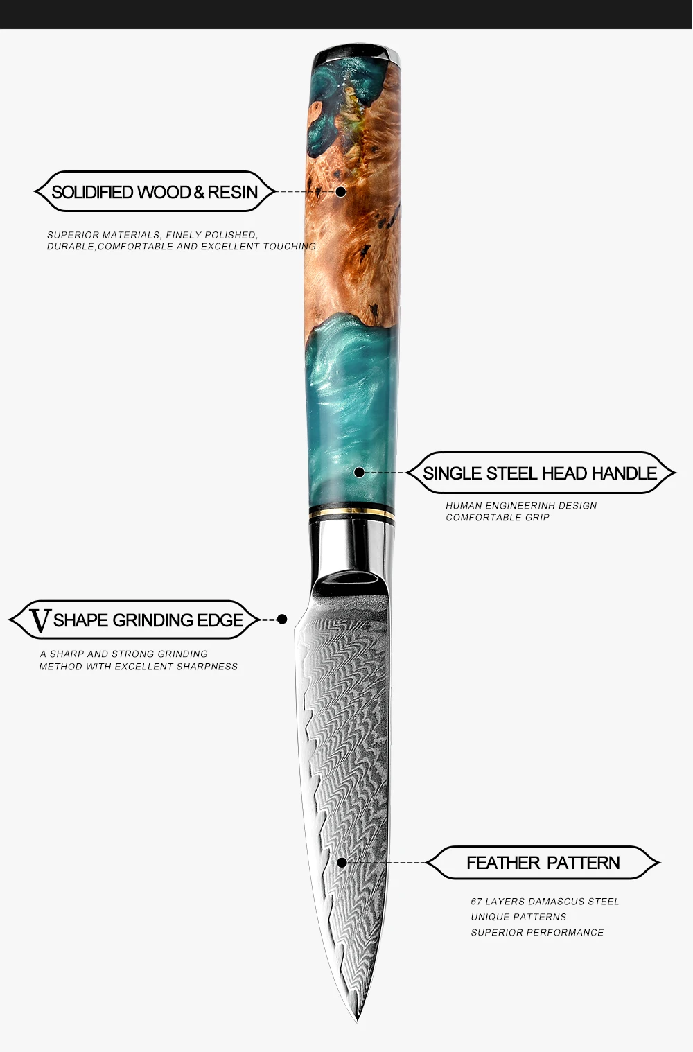 Материал лезвия: 67 слоев дамасской сталиМатериал ручки:Смола +Затвердевшая древесинаРучка изготовлена из синей смолы и затвердевшей древесины. Смола и древесина объединяются специальным производственным процессом, поэтому красота каждой ручки отличается