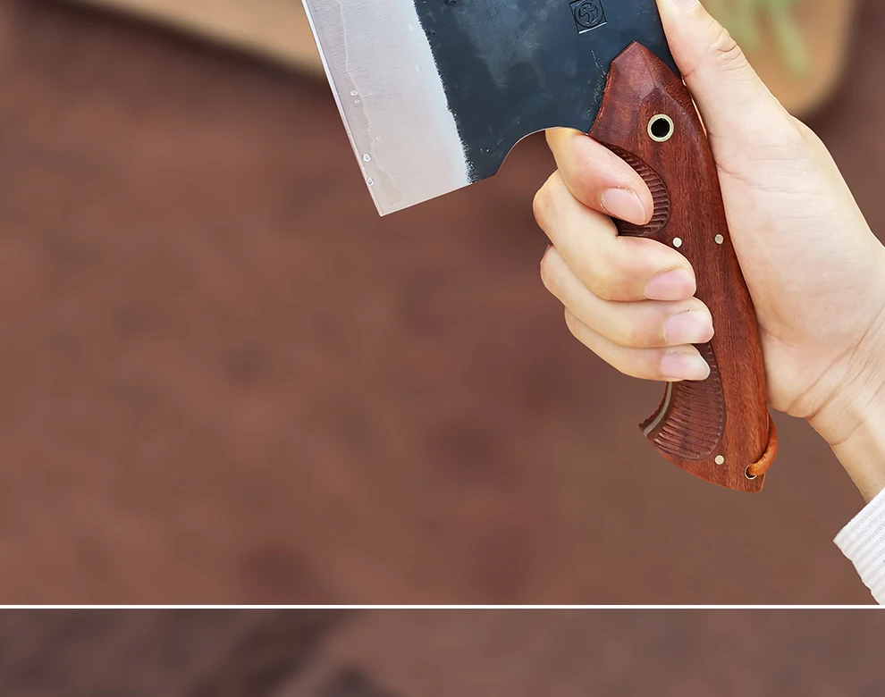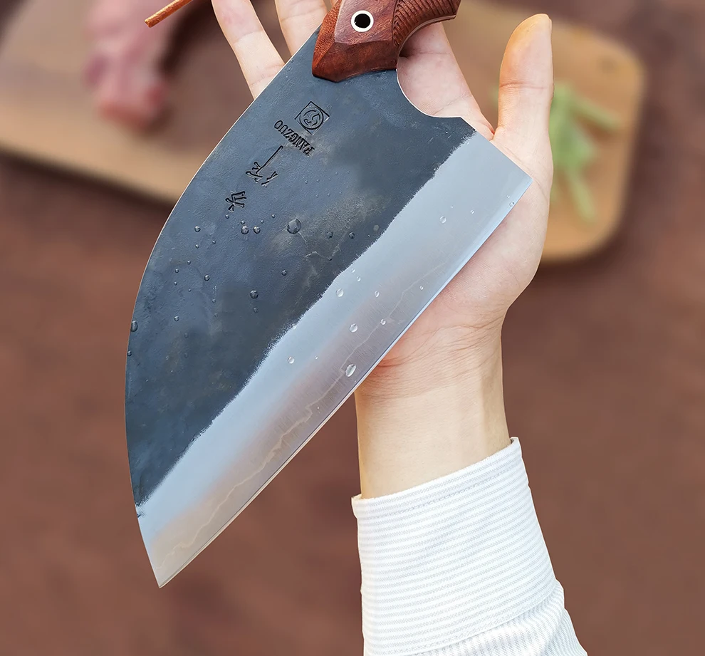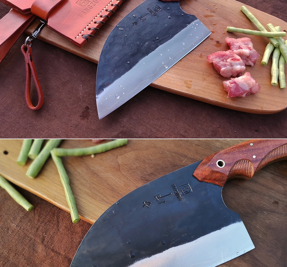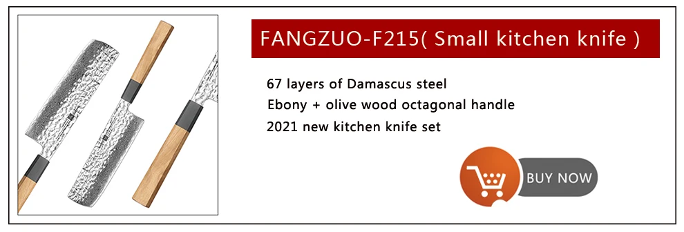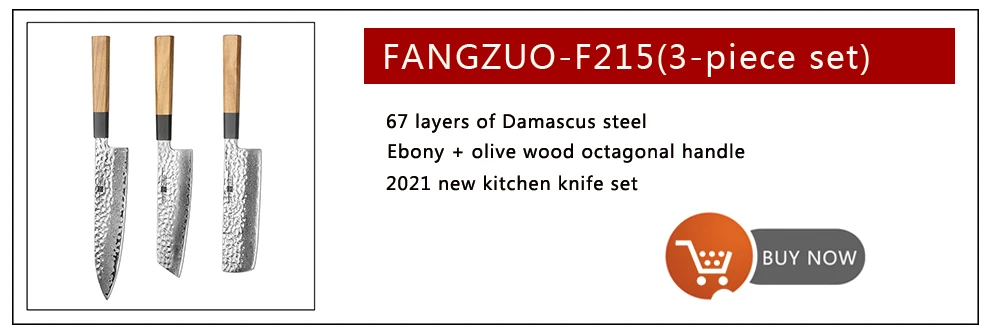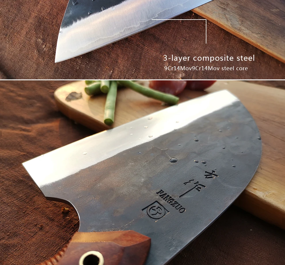 FANGZUO кухонный нож Спецификация Бренд: FANGZUO Модель: F113 нож мясника Материал клинка: 3-слойная композитная сталь (сталь сердечника 9Cr14CoMov) Длина клинка: около 193 мм Полная длина: около 315 мм Толщина: около 3,0 мм Вес: около 472 г Изготовление: Ручная ковка Твердость: ≈ 59HRC Ручка: Эбеновое дерево и оливковое дерево Используется для: подходит для приготовления пищи на кухне, нарезки мяса, нарезки овощей, фруктов и т. д. (Не используйте его для резки костей или твердой пищи)