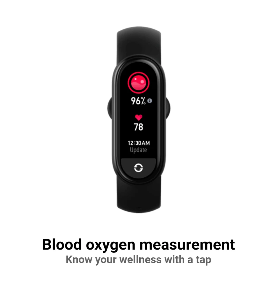 %Насыщение крови кислородом является одним из основных признаков измерения здоровья человека. С помощью оптического пути дизайн, мульти-светильник источник fusion и профессиональный алгоритм поддержки, я может точно измерить оксиметр через Mi Band 6 в любом месте и в любое время и в любом месте и рады предложить вам полное представление о своем здоровье.