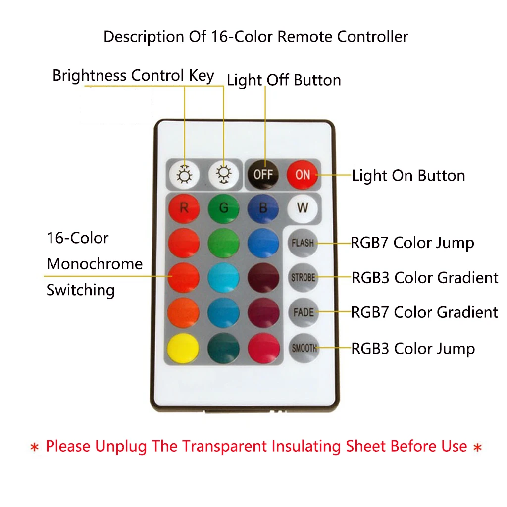 Режим дистанционного управления: пульт дистанционного управления с включением/выключением, 16 цветов, регулируемая яркость, режим вспышки, плавный режим.