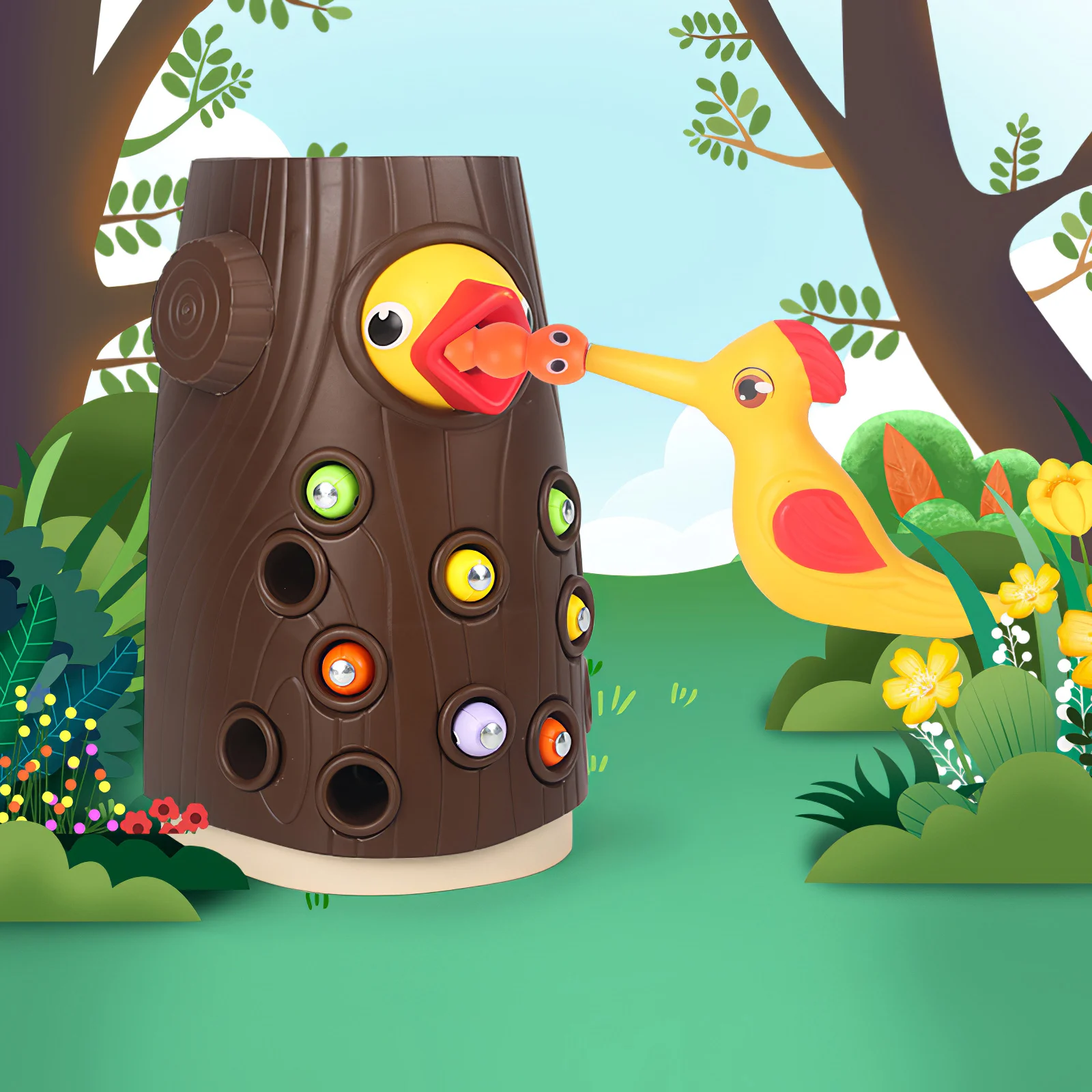 12 червей поставляются с оранжевым, зеленым, желтым и фиолетовым, четыре разных цвета. Дети могут использовать птицу, чтобы высасывать червей из дерева. Во время процесса он может помочь повысить способность распознавания цветов детей, координацию рук и глаз и логическое мышление.