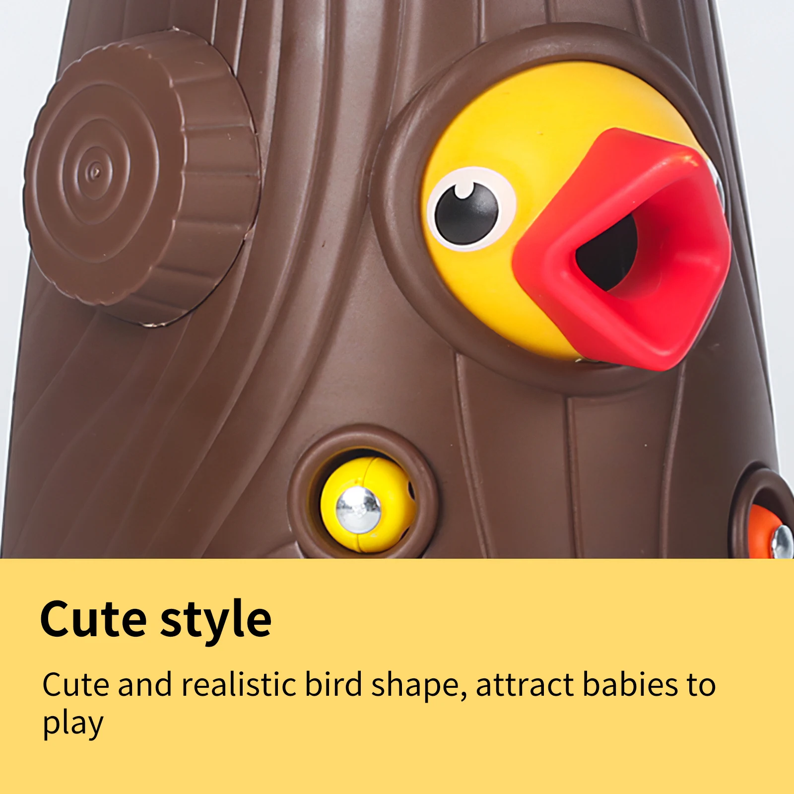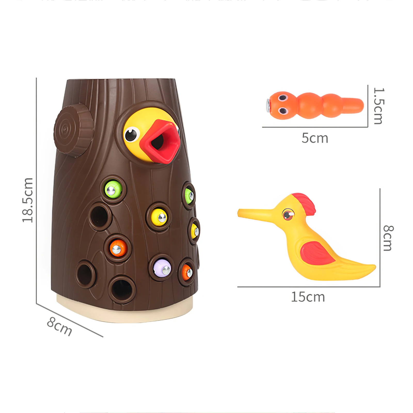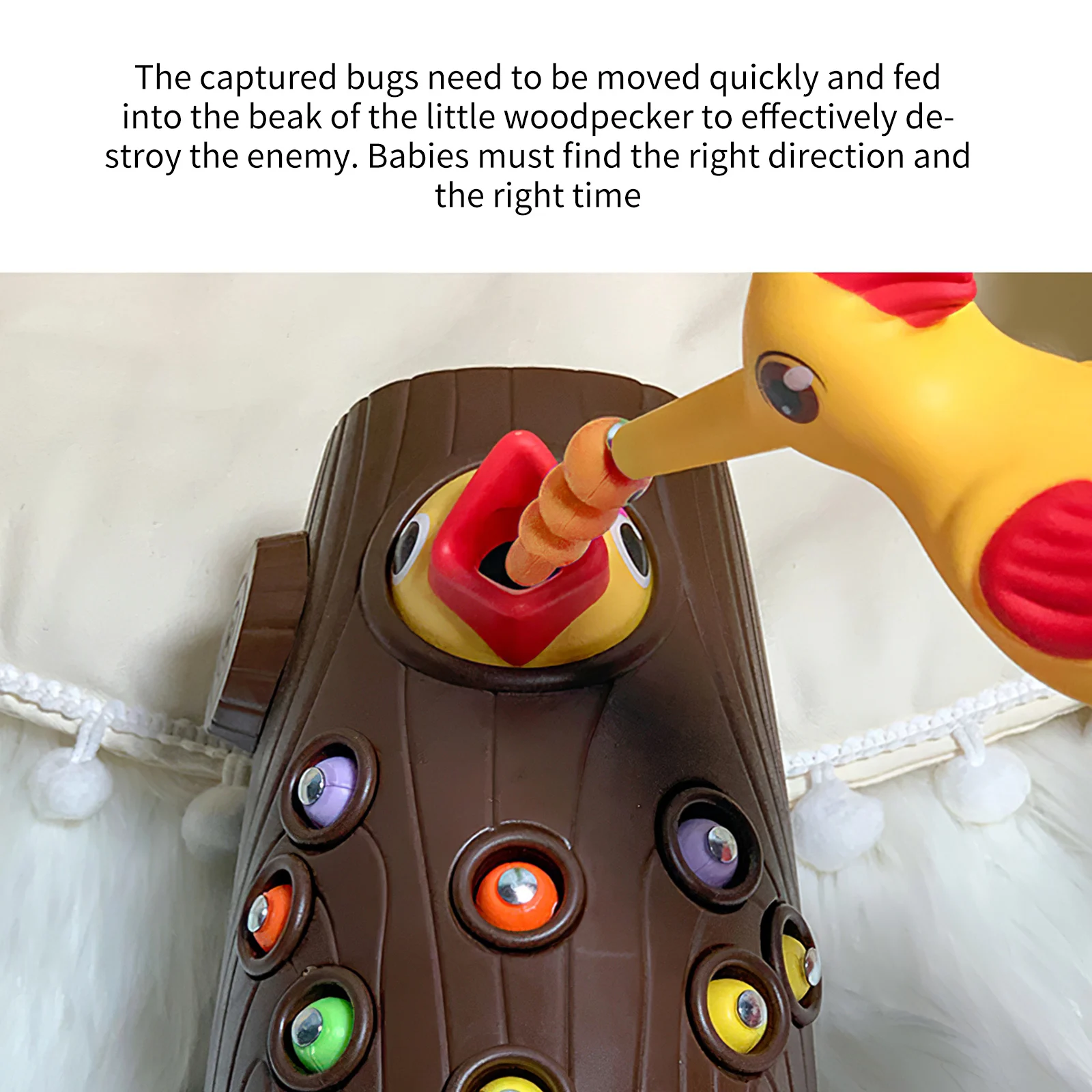 12 червей поставляются с оранжевым, зеленым, желтым и фиолетовым, четыре разных цвета. Дети могут использовать птицу, чтобы высасывать червей из дерева. Во время процесса он может помочь повысить способность распознавания цветов детей, координацию рук и глаз и логическое мышление.