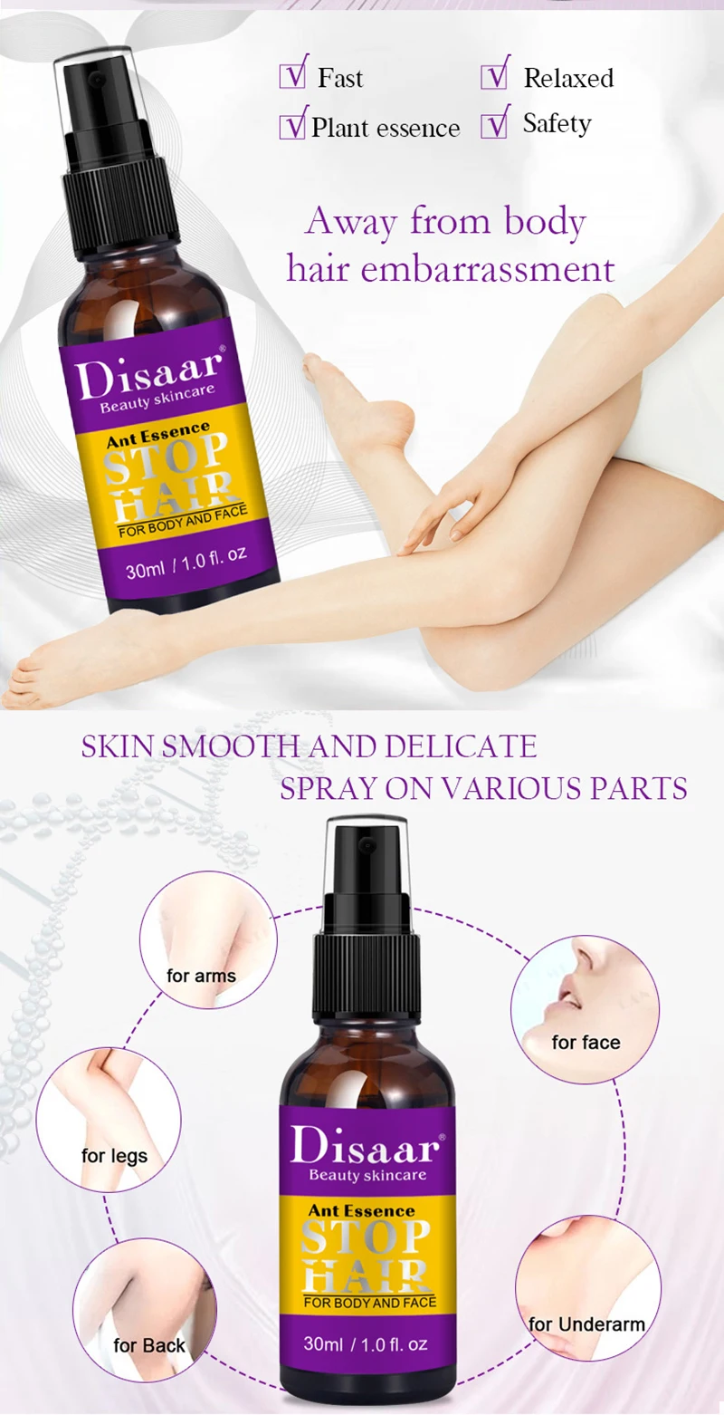 Название продукта: Спрей Против волос с муравьиным маслом Вес нетто: 30 мл Использование: лицо и тело Функция: эффективно подавляет рост волос на лице, губах, подмышках, ногах, груди и руках, не повреждая поры, и имеет двойную функцию подавления ухода за волосами и кожей.