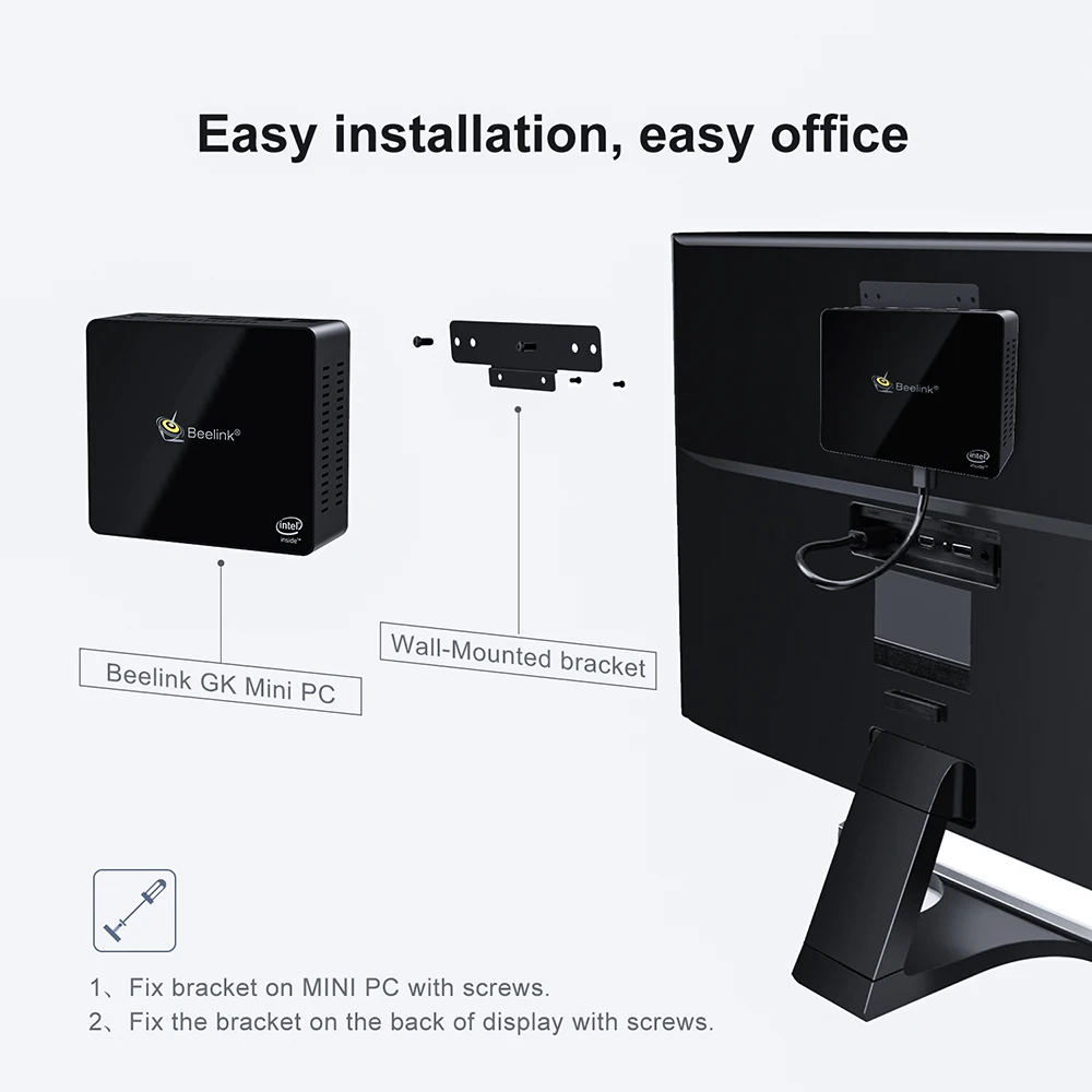 Какая посылка? 1 * Beelink GKmini Mini PC 1 * зарядное устройство(США/ЕС/Великобритания/Австралия) 1 * HDMI кабель 1 * Руководство (на английском языке) 1 * Настенный кронштейн |