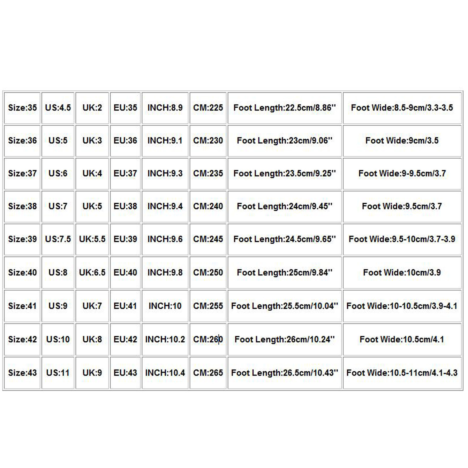 | Размер | США | Великобритания | ЕС | Дюйм | См | Длина стопы | Широкая стопа |