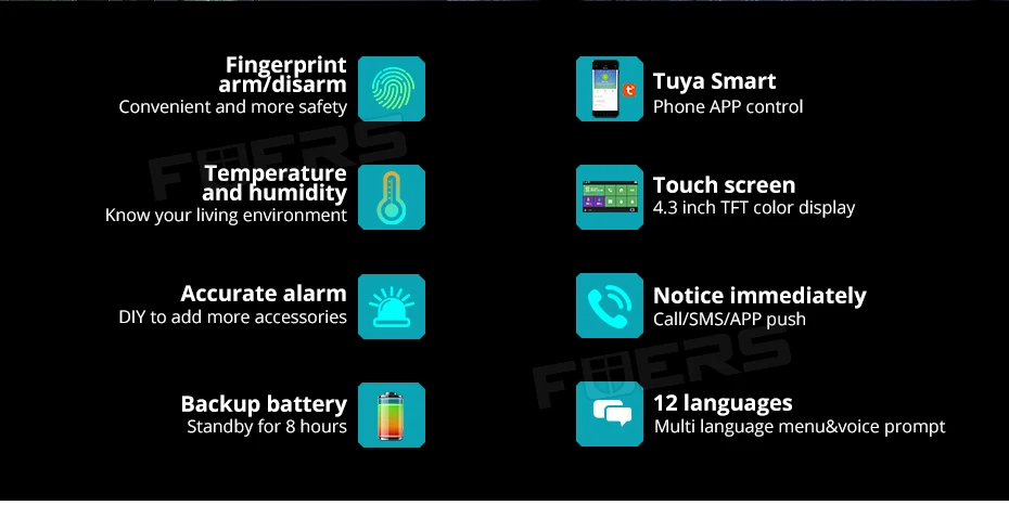 Система может быть вооружена/обезоружена на месте по отпечатку пальца, сенсорной панели, поставляемой дистанционной бирке или удаленно из любого места с помощью нашего бесплатного специального мобильного приложения.