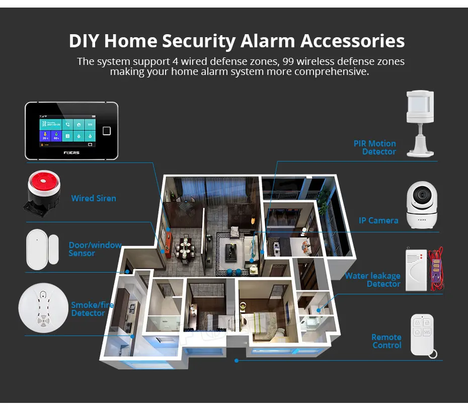 К концентратору можно подключить до 100 беспроводных датчиков, 4 проводных зоны, 10 удаленных тегов, несколько беспроводных сирен и Внешняя Сирена. В случае активации будильника, например, при срабатывании датчика, внутренняя сирена ступицы на месте 80 дБ, дополнительная внешняя или беспроводная сирена на 100 дБ, И будет отправлено push-уведомление, и сигнал тревоги будет автоматически передан всем зарегистрированным пользователям.