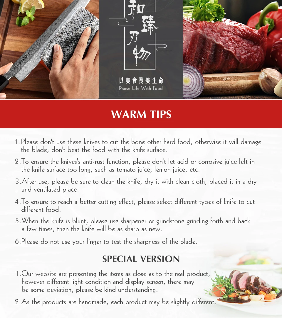 Продукт: 270 нож Bunka Материал лезвия: 110 слоев Дамасская супер сталь Материал ручки: высококачественная древесина пустыни Северной Америки + черный G10 Твердость сердечника: 60 ± 1 HRC Угол края: 15 градусов на одну сторону Процесс обработки поверхности: полировка, высококачественный внешний вид Характеристики: острый и прочный, супер антикоррозийный, светильник Уровень резкости: уровень силы резания: 6,0-8,0 N международные стандарты. Упаковка: красивая подарочная коробка.