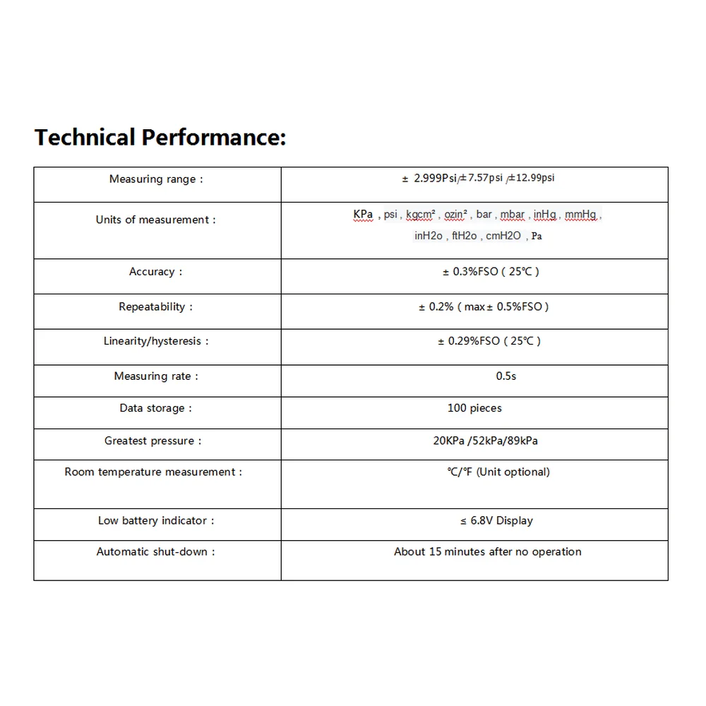 ✔Этот инструмент может измерять дифференциальное давление/положительное давление/отрицательное давление, и оснащен простым устройством соединения шланга. Не работает в течение 15 минут, автоматическое выключение.