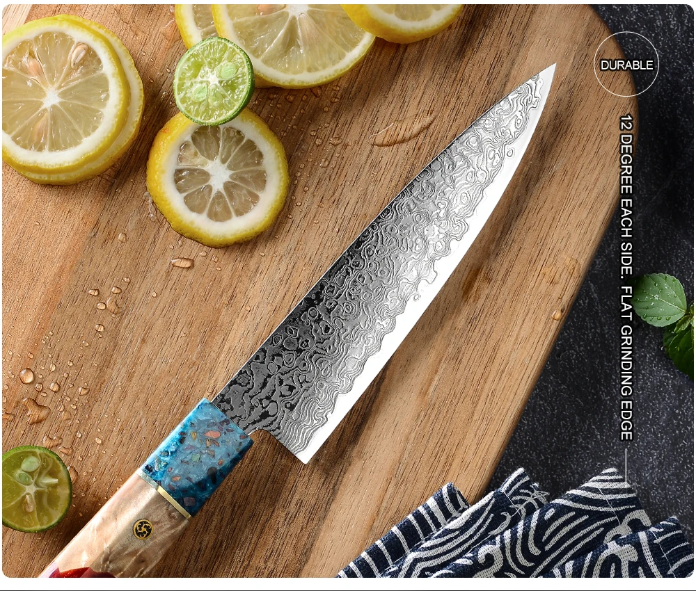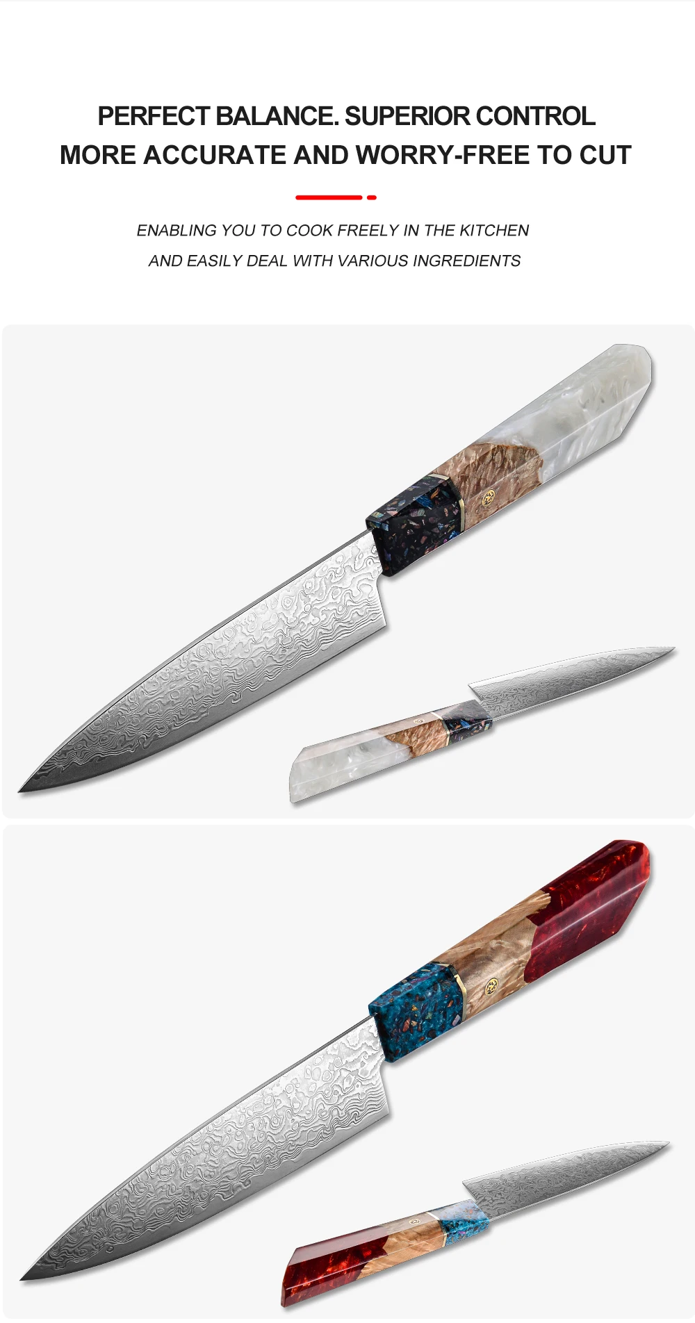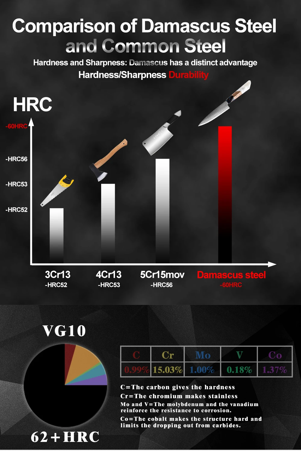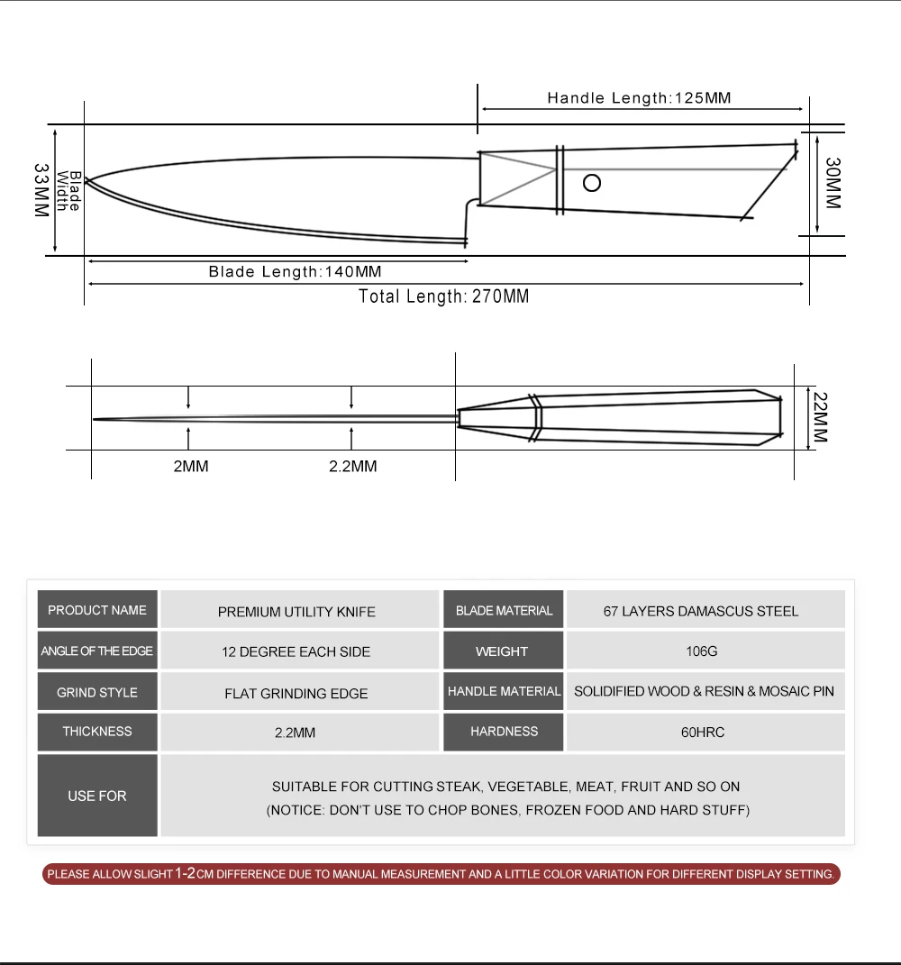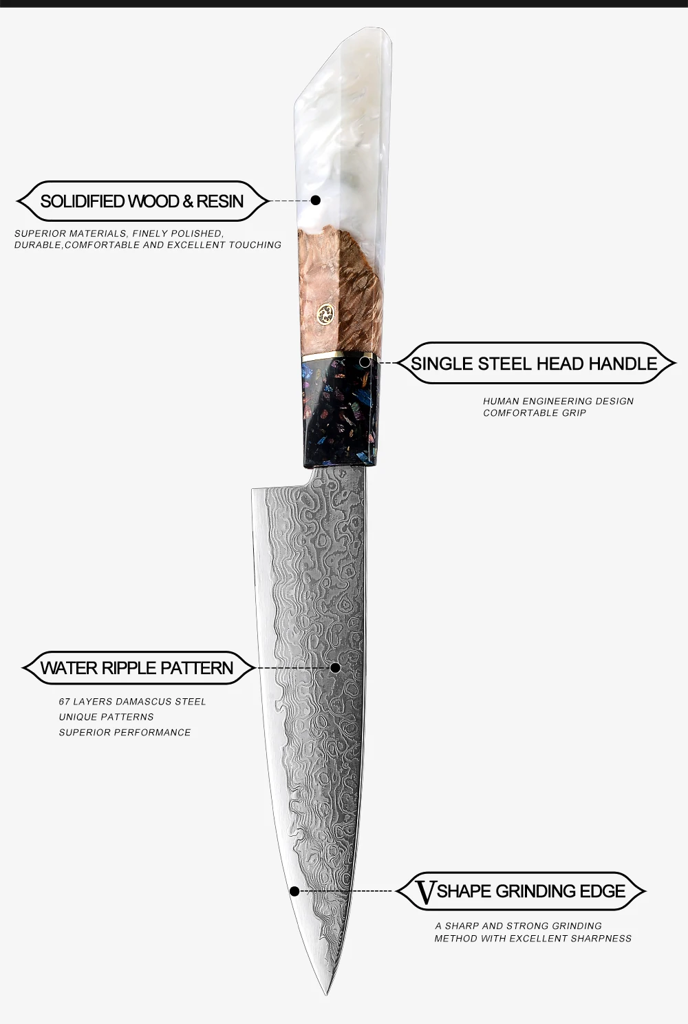 Материал лезвия: 67 слоев дамасской сталиМатериал ручки:Смола +Затвердевшая древесина+ Мозаика булавкаОбщая длина: 270 мм