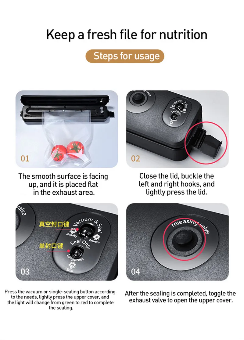 1.When using the vacuum sealing machine, please use a special grooved sealing bag, otherwise the air can not be pumped out.
