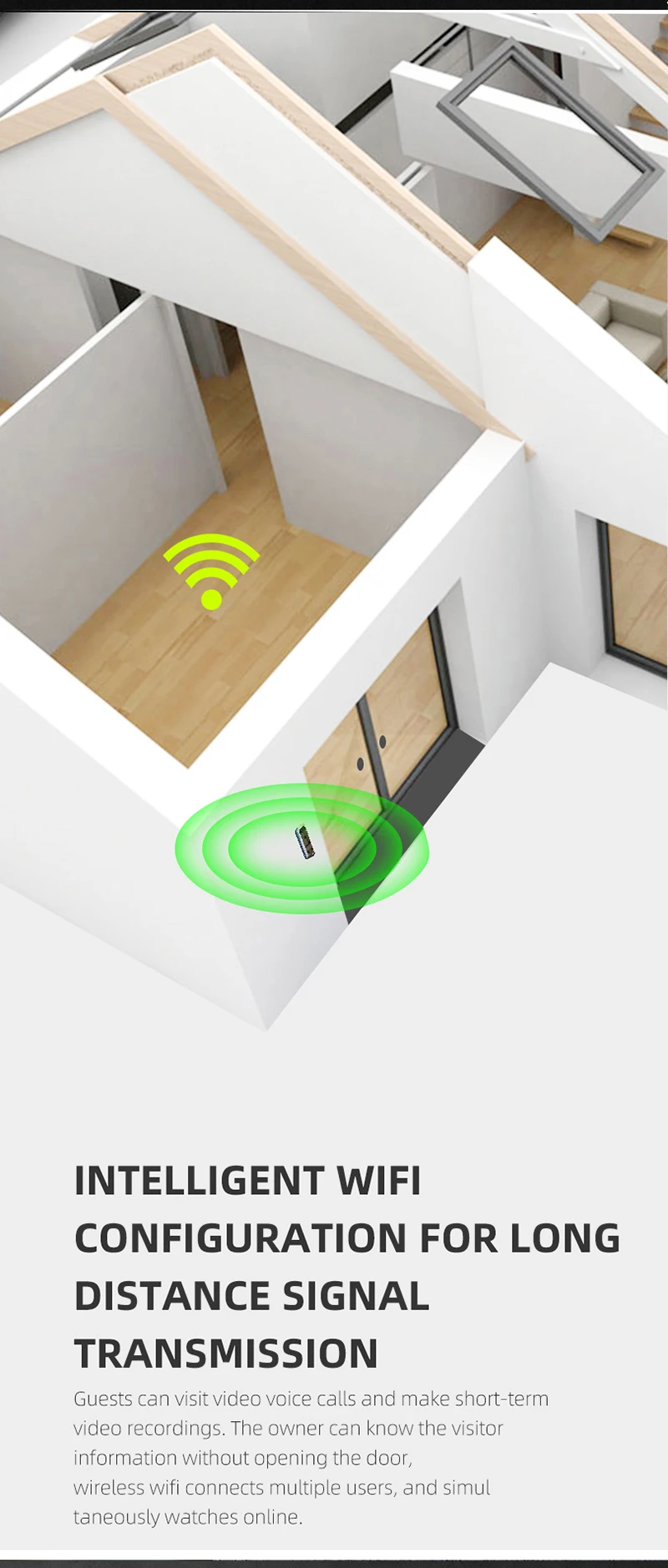 Гости могут посетить видеозвонки и сделать кратковременные видеозаписи. Владелец может узнать информацию о посетителе, не открывая дверь, беспроводной wifi соединяет нескольких пользователей, и одновременно Часы онлайн.