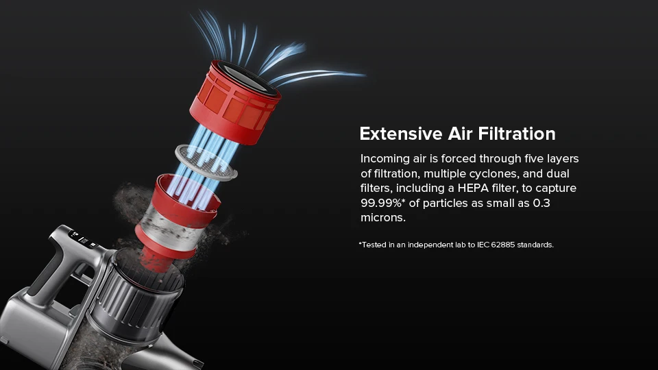 Экстремальное всасывание 160AWЭкстремальное всасывание, генерируемое многослойным крыльчаткой, вытягивает грязь из глубоко внутри ковров, кроватей, автомобильных сидений и многого другого.Обширная фильтрация воздухаВходящего воздуха принуждается через пять слоев фильтрации, циклоны и двойные фильтры, в том числе HEPA фильтр, чтобы захватить 99.99% частиц как малых по мере того как 0,3 микрона.Устранение загрязняющих веществ и аллергеновПять этап очищения воздуха система фильтров до 99.97% частиц до 0,3 мкм. Только чистый воздух выходит из строя.Подставка для мешка для пылиЗамените в пылесборнике, чтобы получить беспроводную вакуумную простоту в использовании, сохраняя чистоту мусорного ведра и избегая протечек при опорожнении.Сохраняет чистку дольше