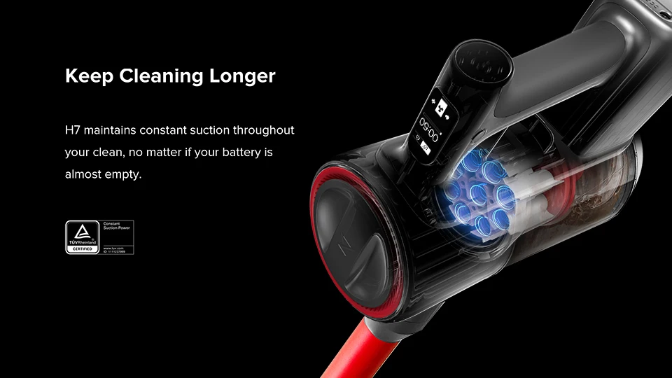 Храните чистку дольшеH7 поддерживает постоянное всасывание во время вашей чистки, независимо от того, ваша батарея почти пустая.