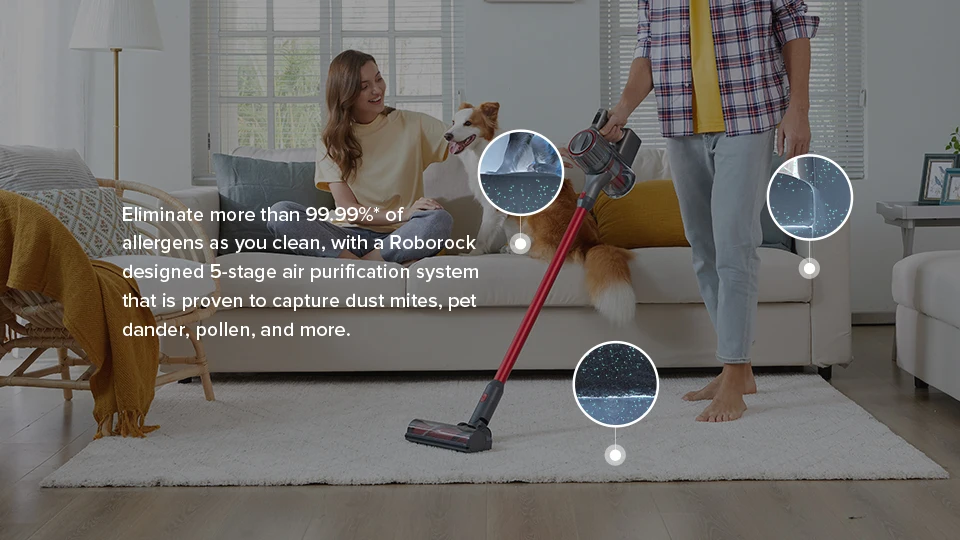 Устранение более чем 99.99% * аллергенов, когда вы моете, с Roborock предназначен 5-ти ступенчатый система очистки воздуха, который доказано, для того чтобы захватить пылевых клещей, ПЭТ andder, пыльцу и т. д.