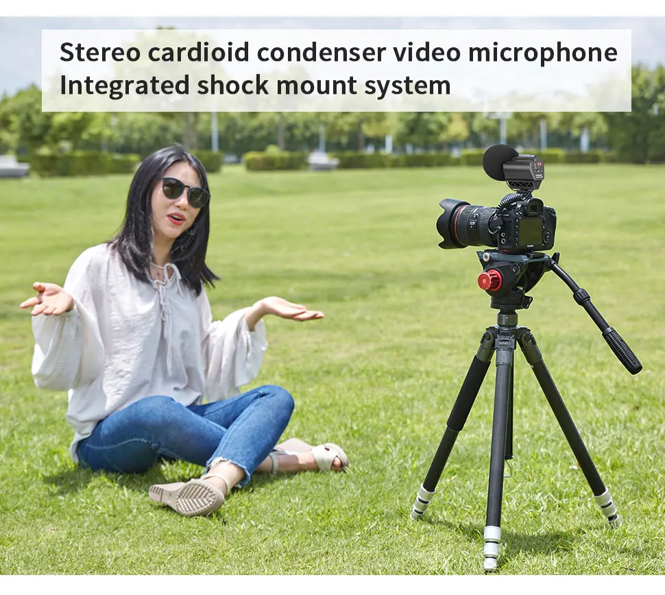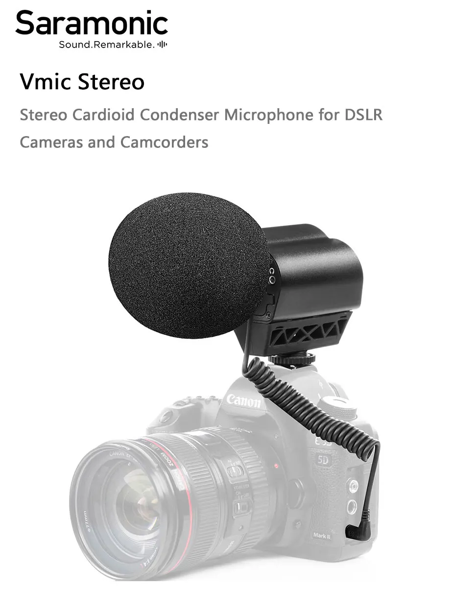 Saramonic Vmic Stereo-это стереокардиоидный конденсаторный микрофон, который обеспечивает профессиональное аудио для DSLR камер и видеокамер. Капсулы для левого и правого микрофона записывают высококачественный стереозвук в камеры и видеокамеры.