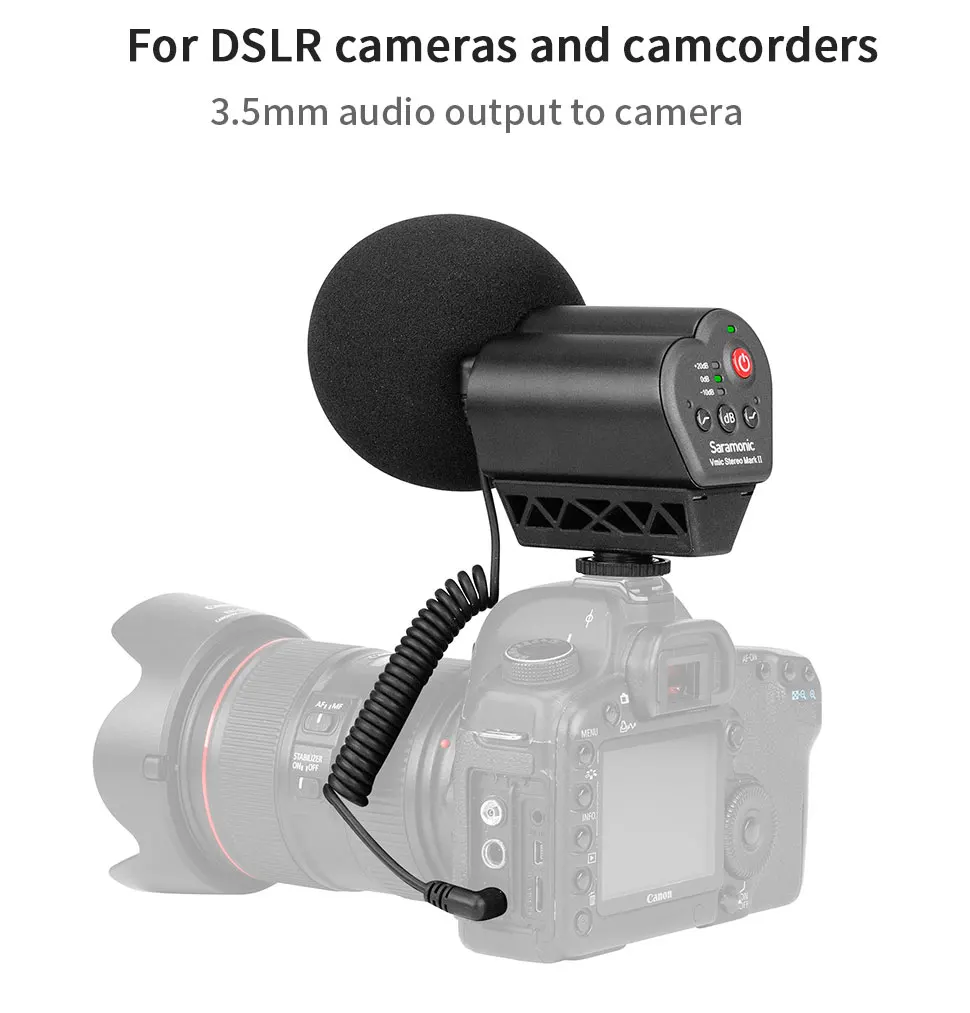 Saramonic Vmic Stereo Mark II-это конденсаторный стереомикрофон на камере, который обеспечивает качество трансляции аудио для DSLR, беззеркальной и видеокамеры s. X/Y рисунок микрофона в капсулах обеспечивает детальную стереозвуку и захватывающий звук для ваших видео. Vmic Stereo Mark II оснащен контролем уровня входного сигнала