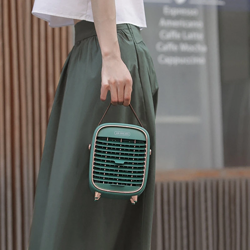 Портативная ручка, легко носить с собой. После полной зарядки охладитель воздуха может использоваться на открытом воздухе вдали от порта зарядки. Он также поддерживает зарядку мобильных устройств.
