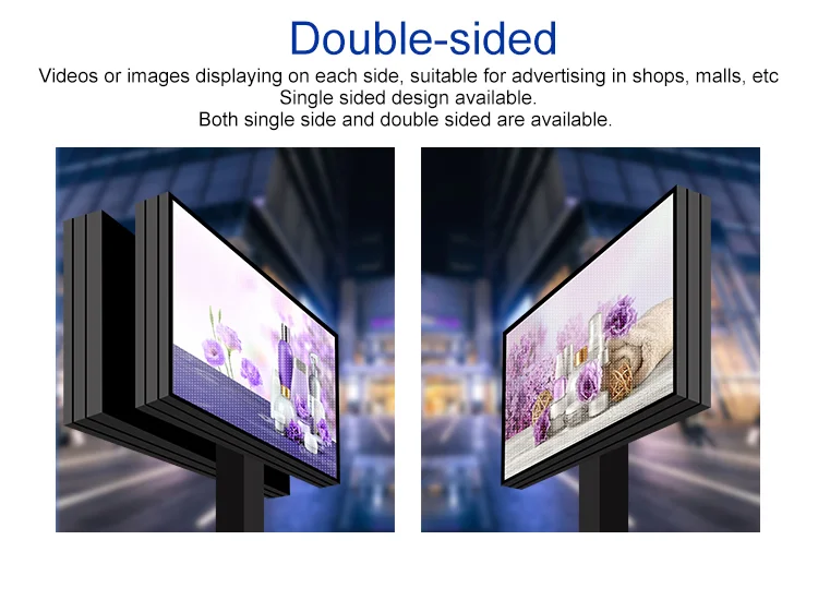 Основная цель светильник Полюс светодиодный дисплей состоит в том, чтобы заменить светильник коробка на полюсам. В настоящее время двойной боковой светильник на рынке может играть максимум две рекламы и группы клиентов должны менять рекламу каждые несколько месяцев, это строгое ограничение для рекламной индустрии. Но светильник Полюс светодиодный дисплей не у прибора какой-то сбой, потому что изготовление рекламных выбросов без каких-либо ограничений, таким образом, это увеличивает коэффициент использования светильник Полюс рекламы позиции. С другой стороны, светильник может отображать только печатную рекламу с помощью изображения, но светильник на экране может воспроизводить динамическую рекламу видео, которая более привлекательна и иллюстративна, чем изображение.