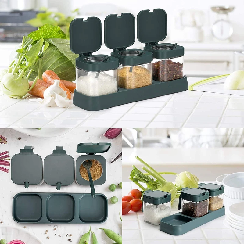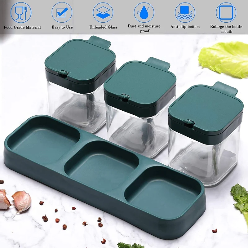 Контейнер для приправ, контейнер для специй, набор из 3 с крышками и ложками, прозрачный стеклянный контейнер для приправ, для кухни, зеленый