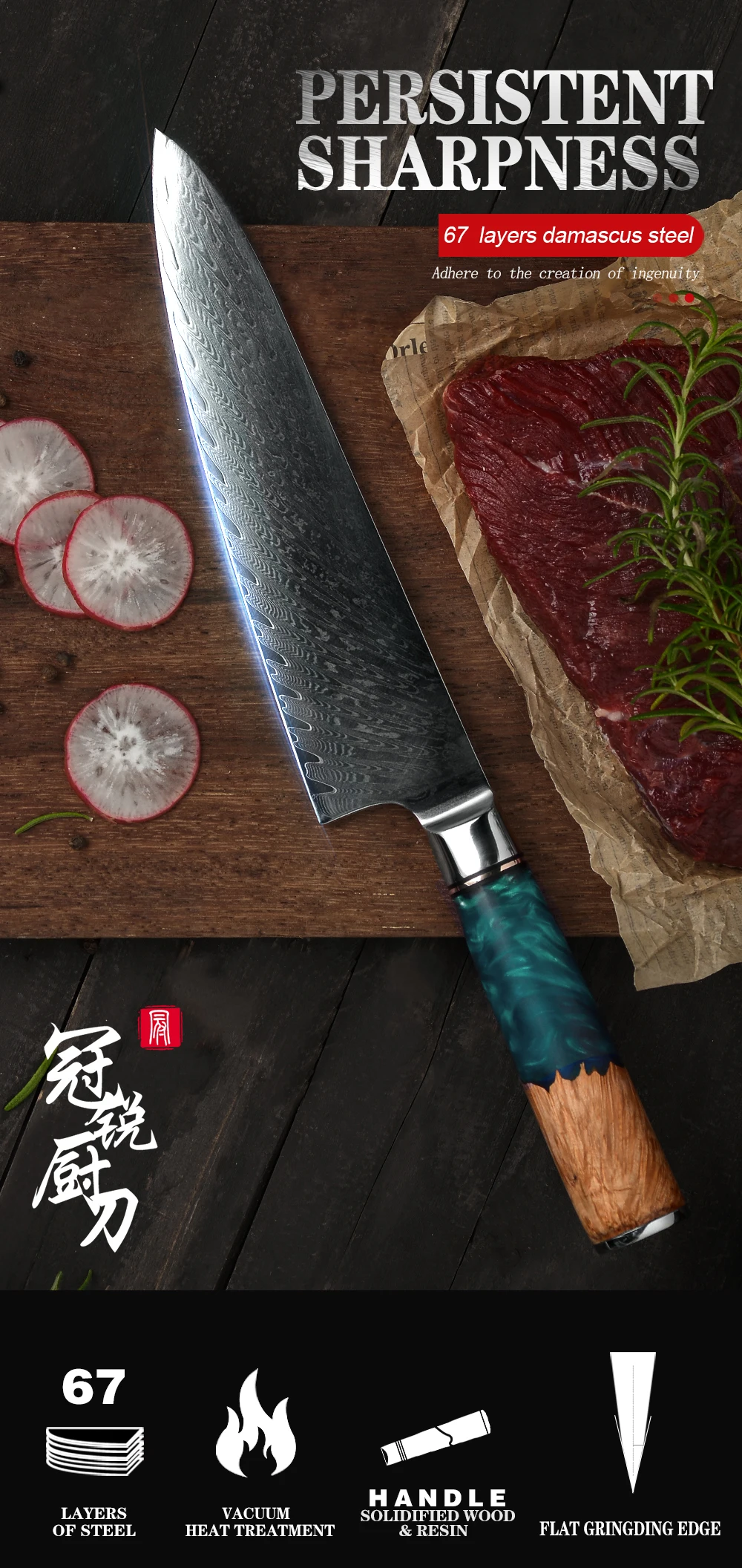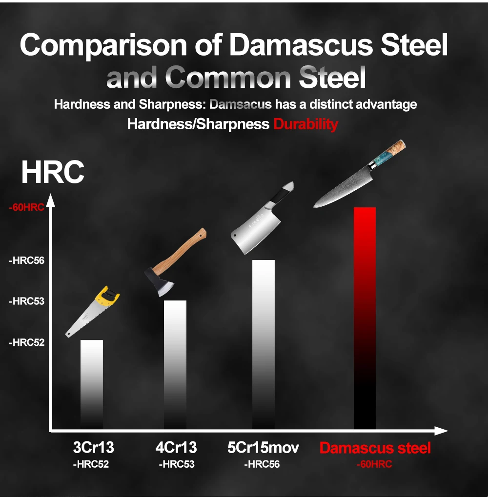 Характеристики:Материал лезвия: 67 слоев дамасской сталиМатериал ручки: смола + затвердевшая древесинаТвердость: 60 HRCВес нетто: 214 гПолная длина: 340 ммДлина лезвия: 200 ммШирина лезвия: 45 ммХарактеристики: острый и прочный, удобный захватПосылка включает в себя:1*8 дюймов дамасский нож шеф-повара1 * ножевая оболочка1 * Подарочная коробка