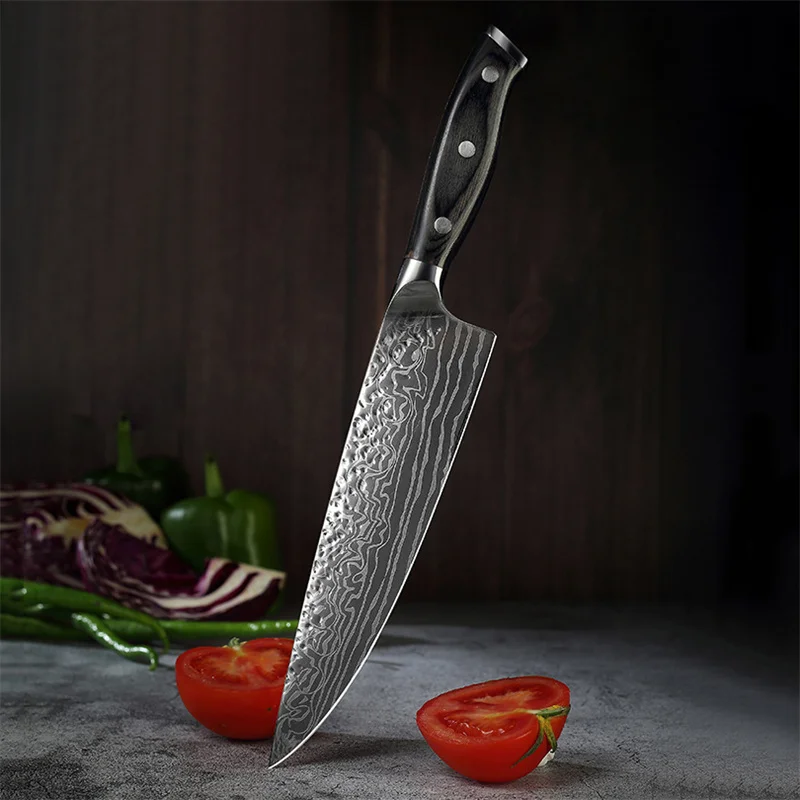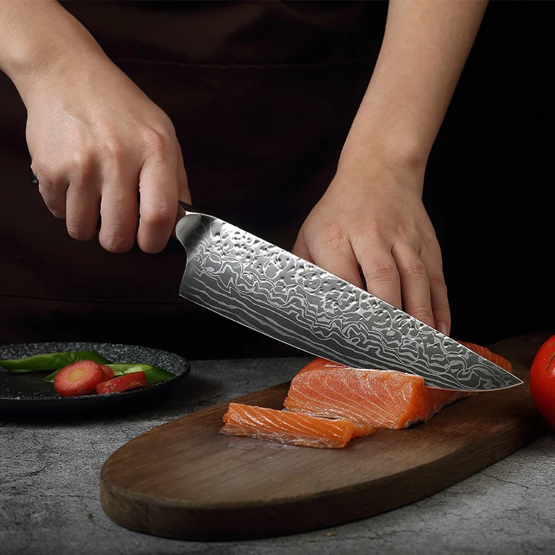 Дизайн поверхности сочетает в себе нож Западного шеф-повара и японский нож. Дамасский узор и синяя ручка из смолы делают нож ярким и элегантным. Это может сделать простую кухню очень красивой. Мелко отполированная aaca, устойчивая к ржавчине, устойчивая к коррозии и легко моется.