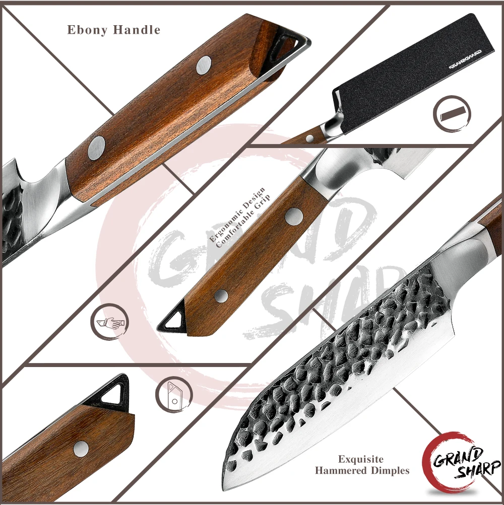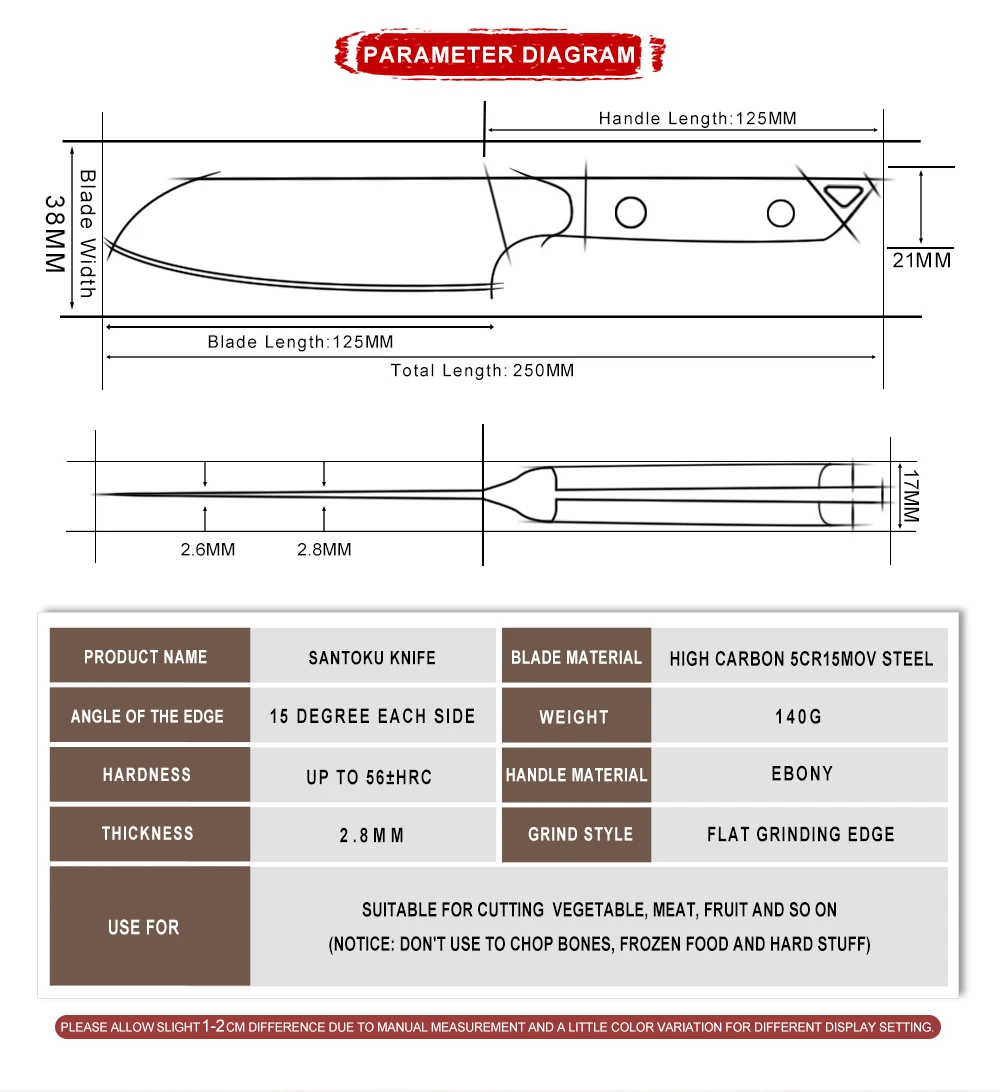 Specifications:Blade Material: High-carbon Clad SteelHandle Material: Ebony WoodAngle of the Edge: 15 Degree one sideSurface Process: Sharp and Durable, High-end AppearanceKnife Weight: 140 g