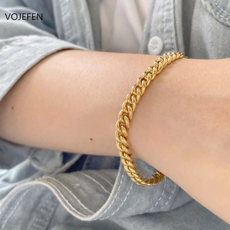 VOJEFEN 18 К серьги из чистого золота браслет Ширина: 5,3 мм кубинской широкая Браслеты для мужчин и женщин, в стиле «хип-хоп» браслет с глубоким широким тиснением Роскошные ювелирные изделия