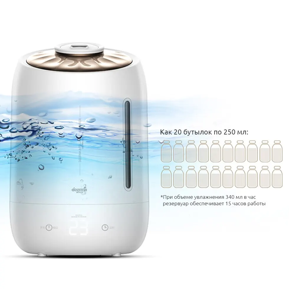 Thanks to the volume of 5 liters, deerma air humidifier can work all day from one tank, and a large display, touch control and convenient settings make it a great choice for lovers for