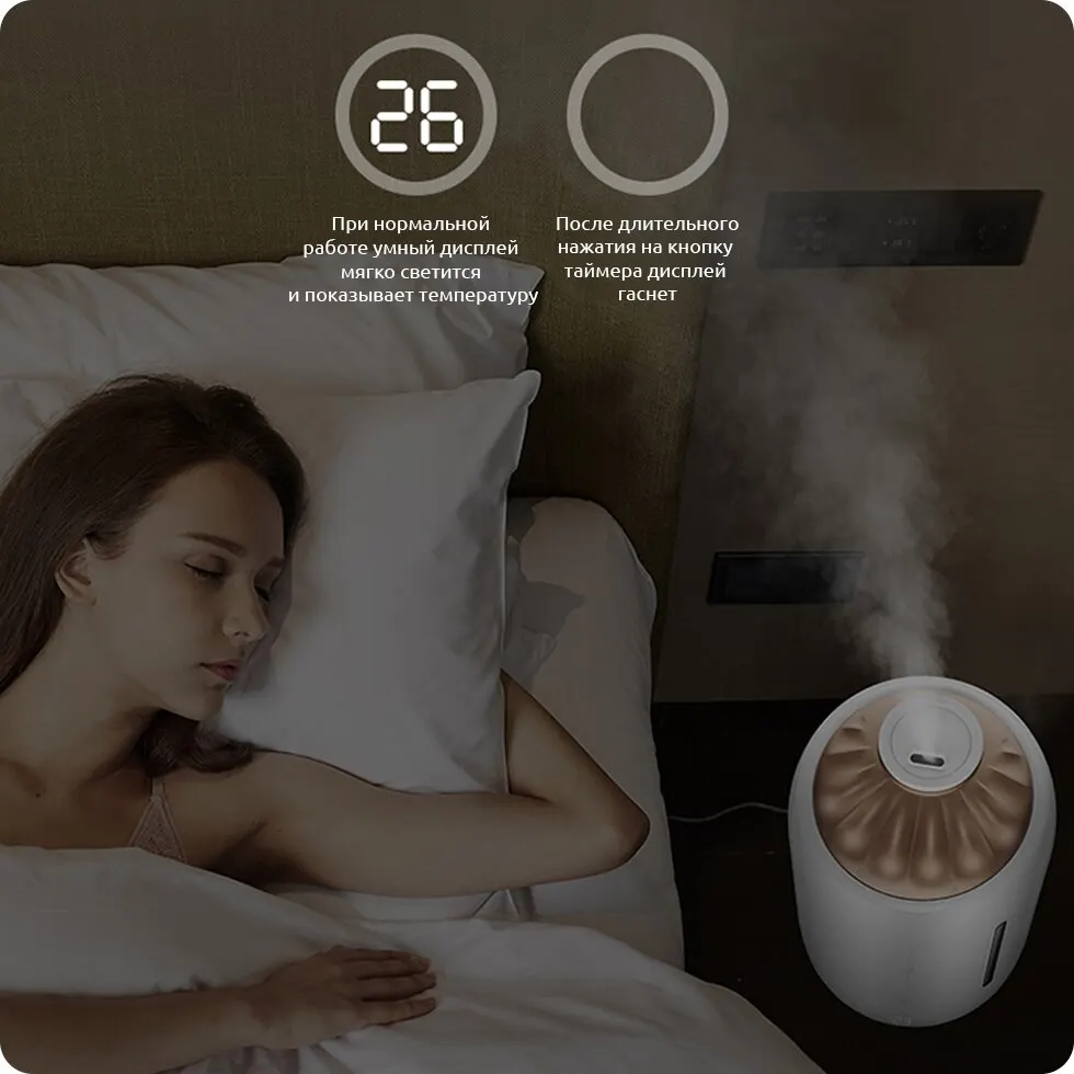 The timer can be turned on by pressing a separate button. Automatically turn on the night mode with the dark time of the day dim display, so as not to disturb the sleep and provide a comfortable level of humidity throughout the night.
