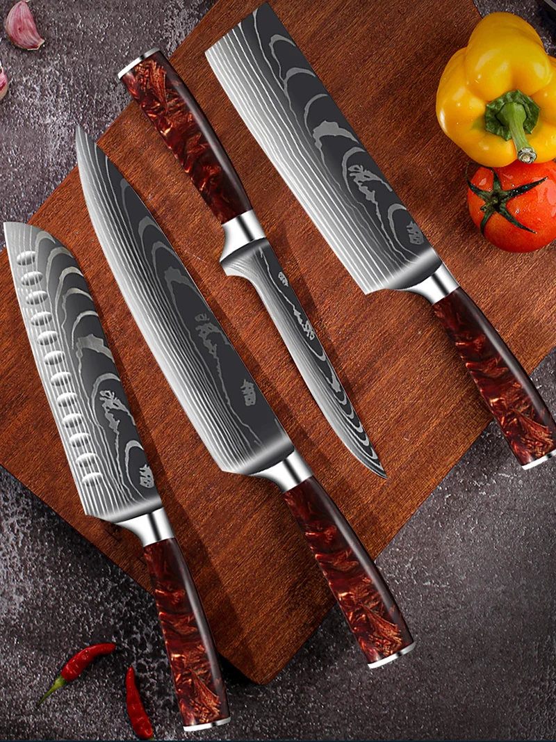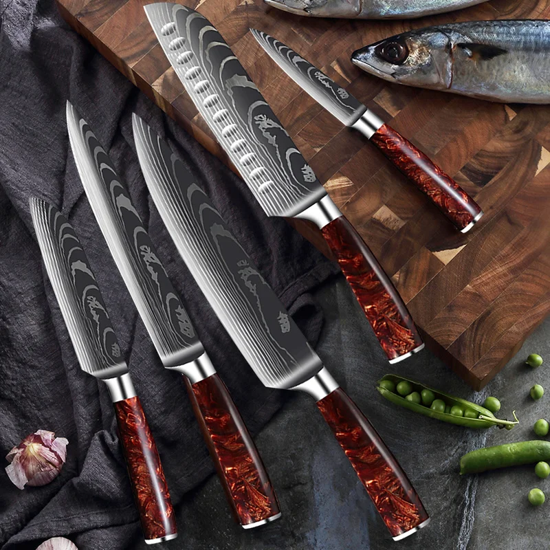 Нож шеф-повара, набор кухонных ножей, лазерный дамасский узор, острый японский нож 7CR17 440C Santoku, нож для резки
