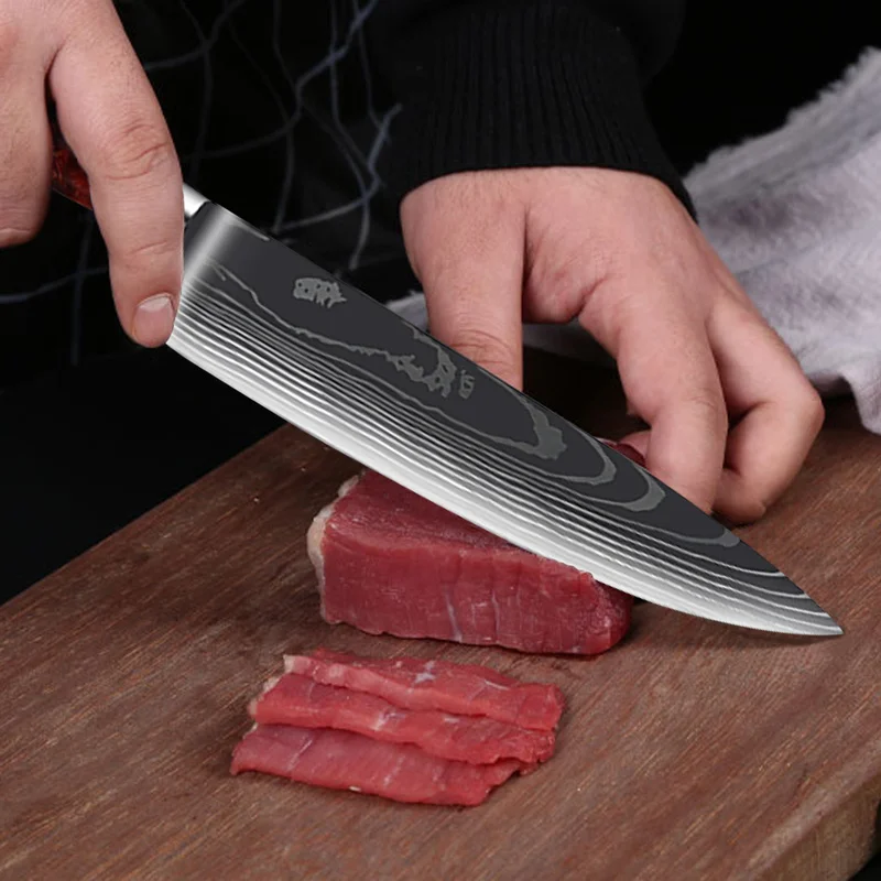 Напоминание: лезвие 7CR1 7 из нержавеющей стали с лазерным Дамасским узором на поверхности. Это очень красиво, хорошее качество изготовления, и очень Шарп. Держите кухню вдали от тупых ножей и наслаждайтесь жизнью на кухне!