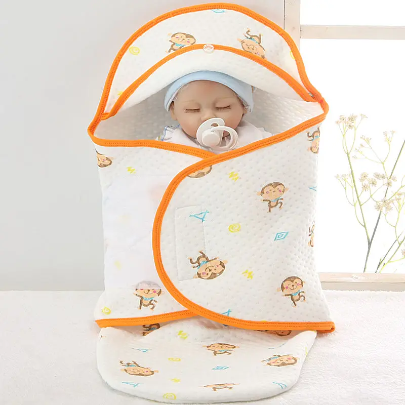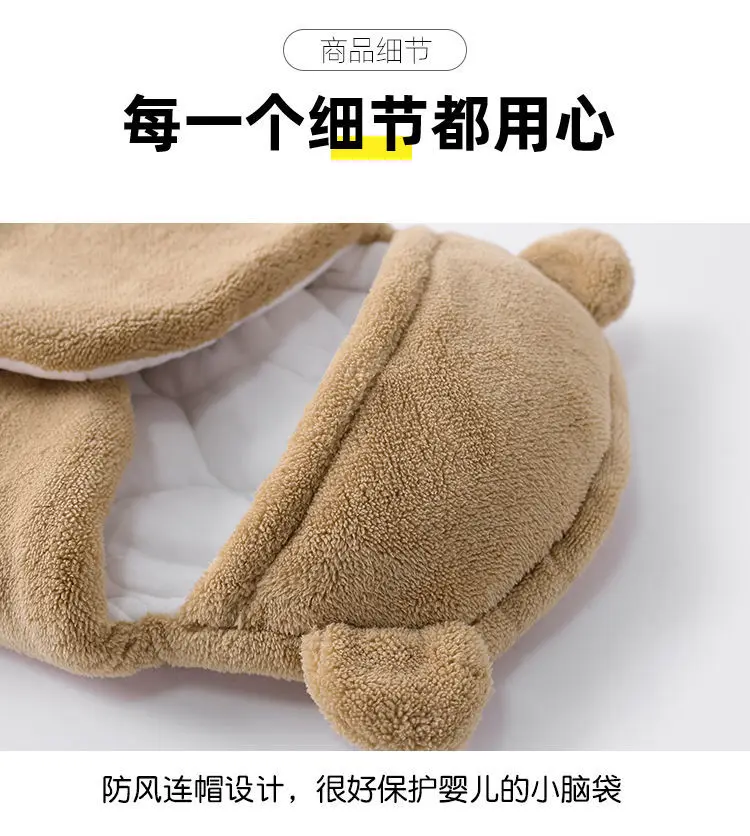 The newborn's warm blanket is thickened in autumn and winter. It is windproof and warm when going out. It is suitable for newborn babies from 0 to 6 months old. Comfortable cotton wool and flannel outside and pure cotton inside. It can be windproof or used as a sleeping bag outside. It doesn't lose hair and color. It feels very good!